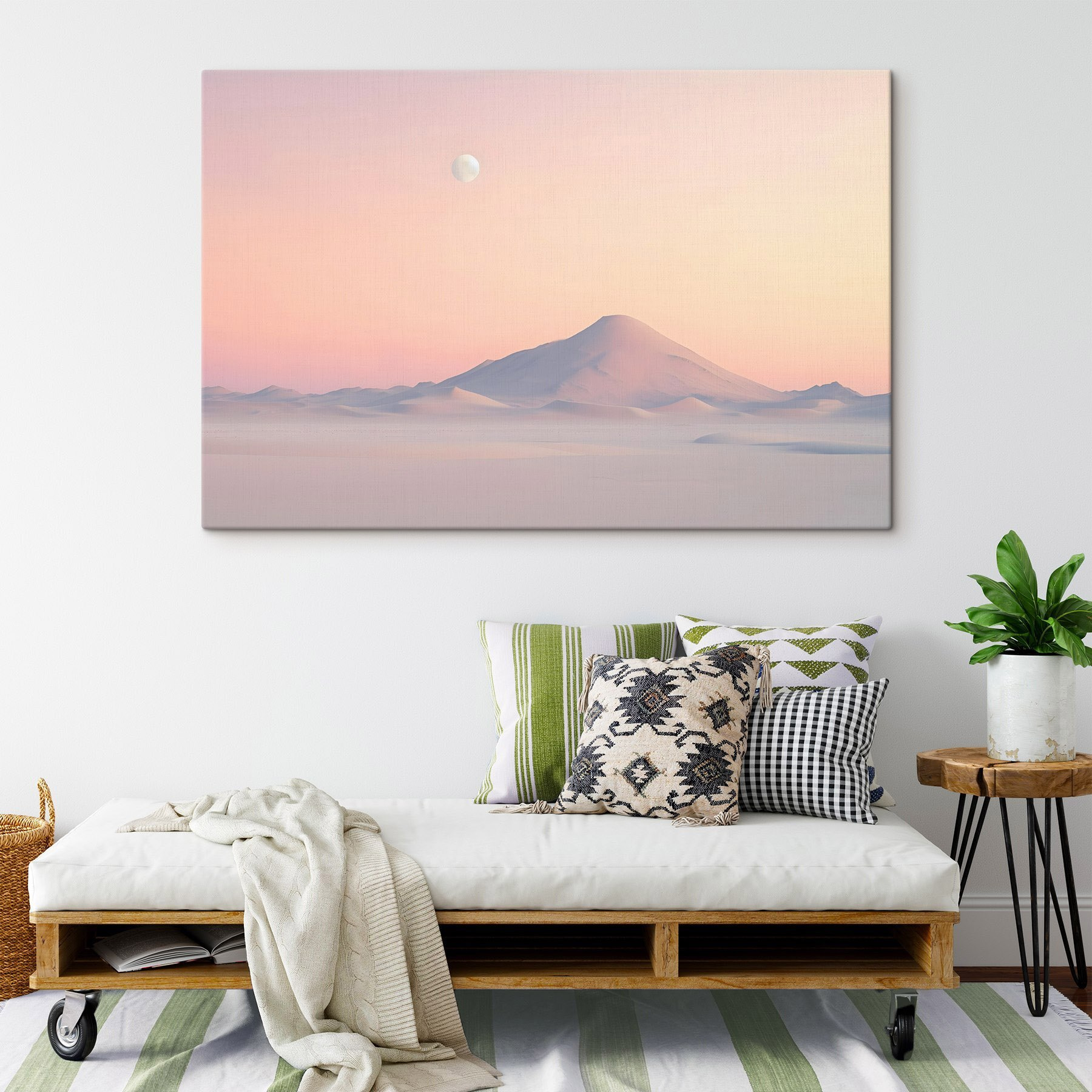 Odmień swoją przestrzeń dzięki marzycielskiemu obrazowi na płótnie “Snow Covered Mountain in a Desert”. Wyobraź sobie, że popijasz poranną kawę, wpatrując się w ten pogodny krajobraz – to dopiero poprawia nastrój! Delikatne pastele tworzą uspokajającą atmosferę, która natychmiast sprawi, że każde pomieszczenie stanie się bardziej zrelaksowane, jakbyś właśnie wszedł do cichego pustynnego odosobnienia.