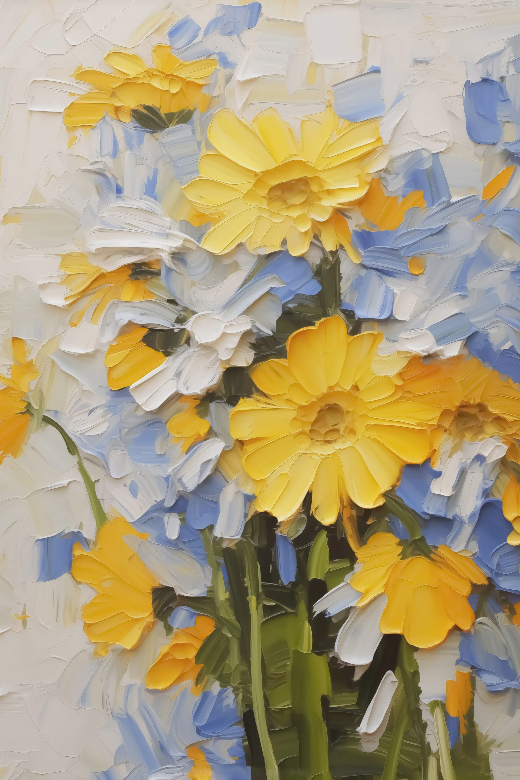 Rozjaśnij swoją przestrzeń dzięki temu pięknemu drukowi na płótnie przedstawiającemu wesołe żółte i niebieskie kwiaty. Idealny do dodania odrobiny koloru, to prawie jak posiadanie słonecznego ogrodu w swoim domu. Wyobraź sobie, że przechodzisz obok niego każdego dnia – te radosne kwiaty mogą wywołać uśmiech nawet w deszczowy poranek. Zabawne pociągnięcia pędzla sprawiają, że jest to przyciągający wzrok element, zachęcający do rozmów i podziwiania. Niezależnie od tego, czy znajduje się w salonie, przytulnym zakątku, czy nawet w domowym biurze, ta grafika wnosi odrobinę natury do wnętrza, sprawiając, że każda przestrzeń wydaje się nieco bardziej żywa.