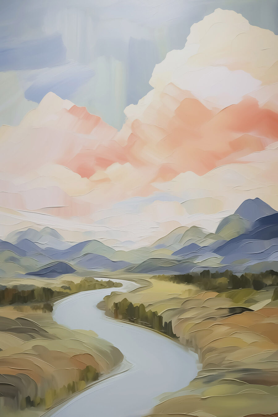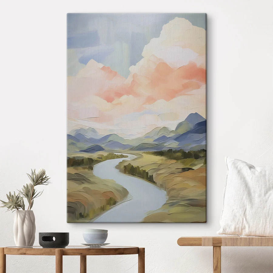 Transform your space with “Canvas Prints River Running Through a Valley.” This piece captures the serene flow of nature, where the river glides effortlessly through lush valleys. Imagine sitting back with a warm cup of coffee, basking in the soft hues of blues and earthy greens, as the gentle curves of the river whisk you away to a peaceful afternoon.