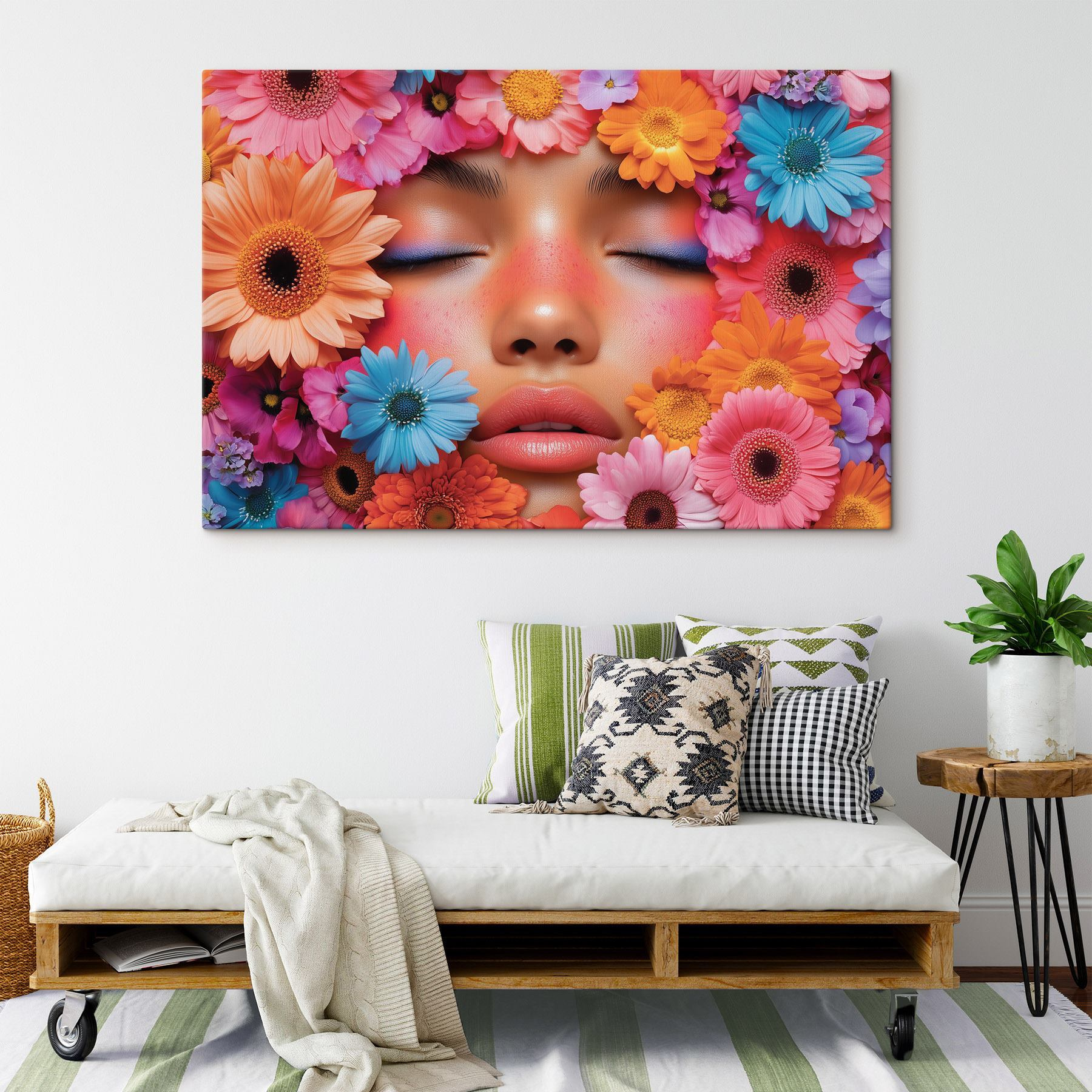 Brighten up any room with “Canvas Prints Woman with Flowers Around Her Face.” It’s like a burst of springtime wrapped in a cozy hug. Imagine the soft petals of daisies and vibrant blooms surrounding a serene beauty—totally enchanting, right? This piece pulls you in, making your heart do a little happy dance. Perfect in a living space or a quiet corner, it sparks joy and invites curiosity. Friends will smile, maybe ponder deep philosophical thoughts—“Why don’t I have more flowers in my life?” Transform your wall into a floral wonderland that feels alive! ✨