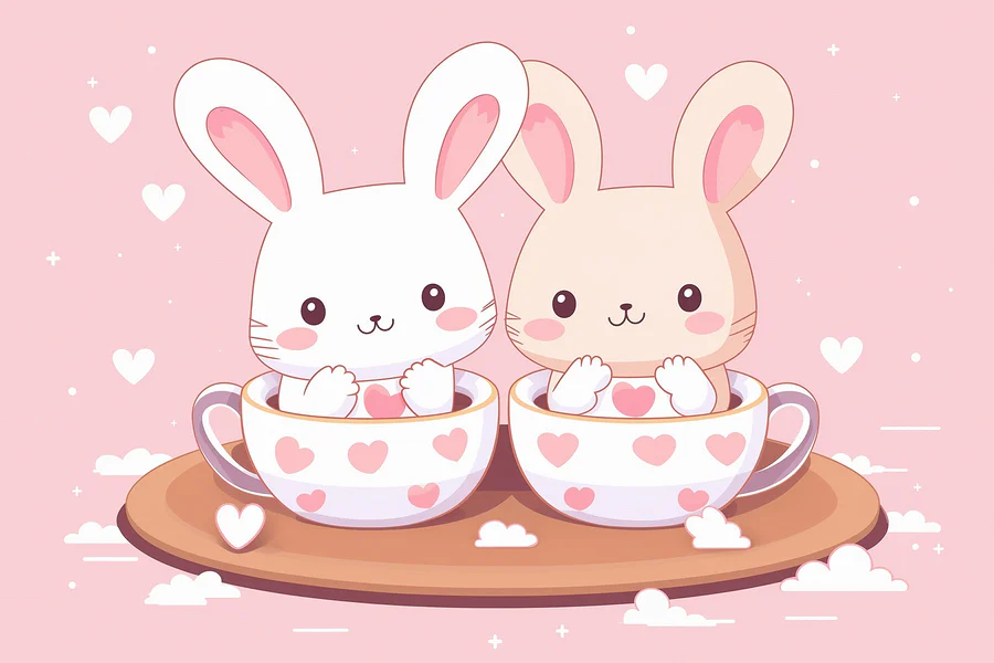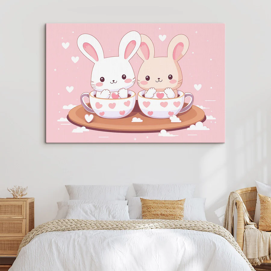 Dodaj odrobinę uroku do każdego pomieszczenia dzięki temu wspaniałemu drukowi na płótnie przedstawiającemu dwa urocze króliki przytulnie wtulone w filiżanki do herbaty. Delikatne pastelowe kolory tworzą przyjazną atmosferę, idealną do dodania ciepła do pokoju dziecięcego lub pokoju zabaw. Wyobraź sobie, że popijasz herbatę i chichoczesz do tych małych stworzeń, z ich zaróżowionymi policzkami i serduszkami wokół nich. To jak kapryśny uścisk dla twoich ścian. Ten kawałek nie tylko rozjaśnia przestrzeń, ale także wzbudza poczucie radości i zabawy. Świetny dla każdego, kto wierzy w odrobinę słodyczy, aby podnieść na duchu codzienność!