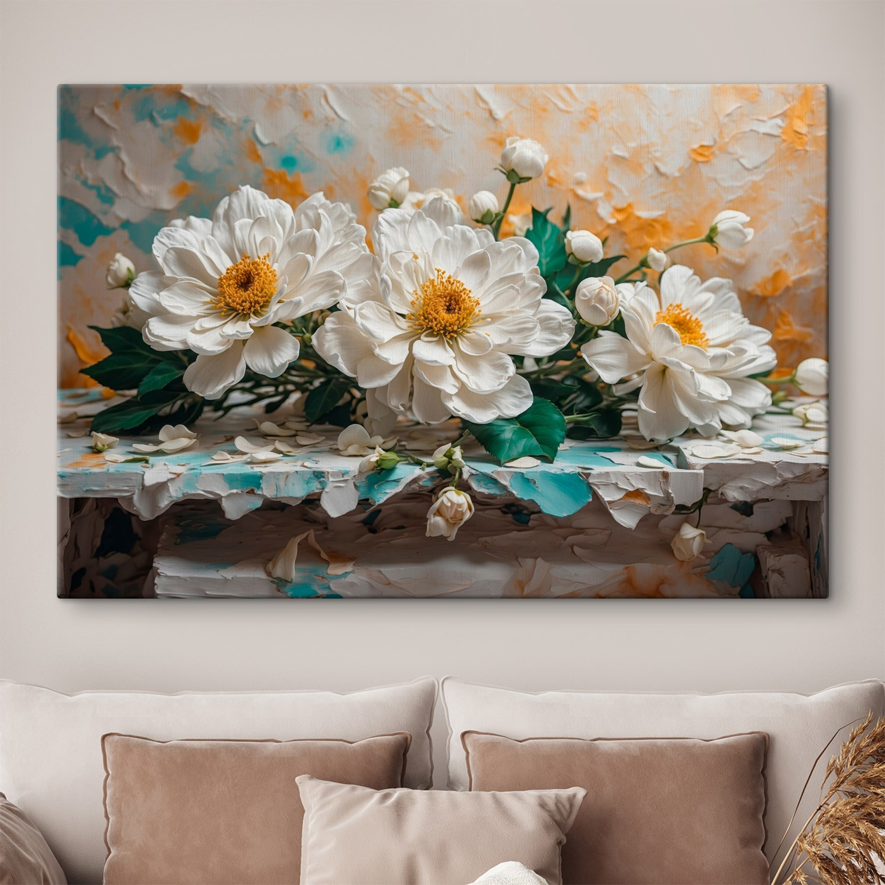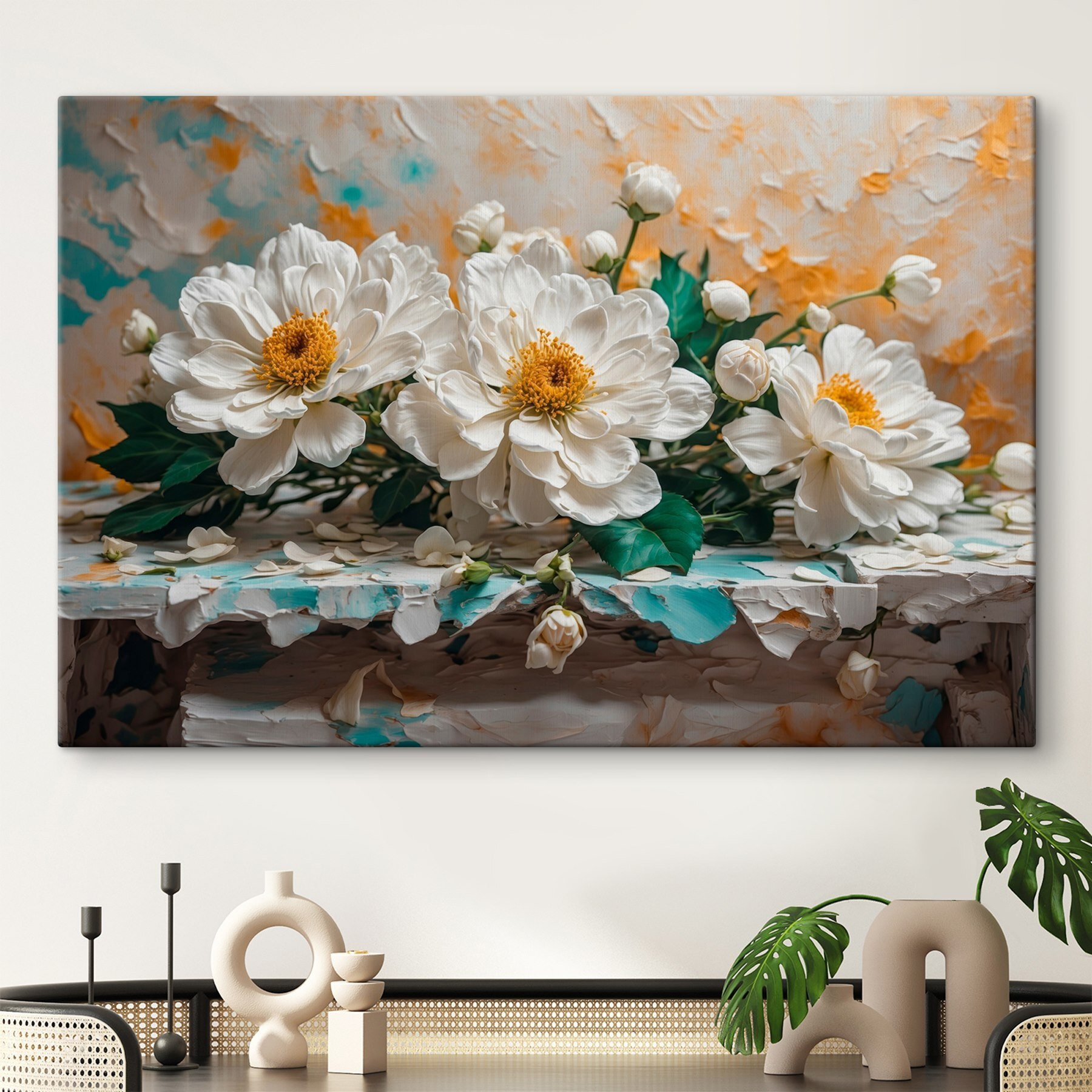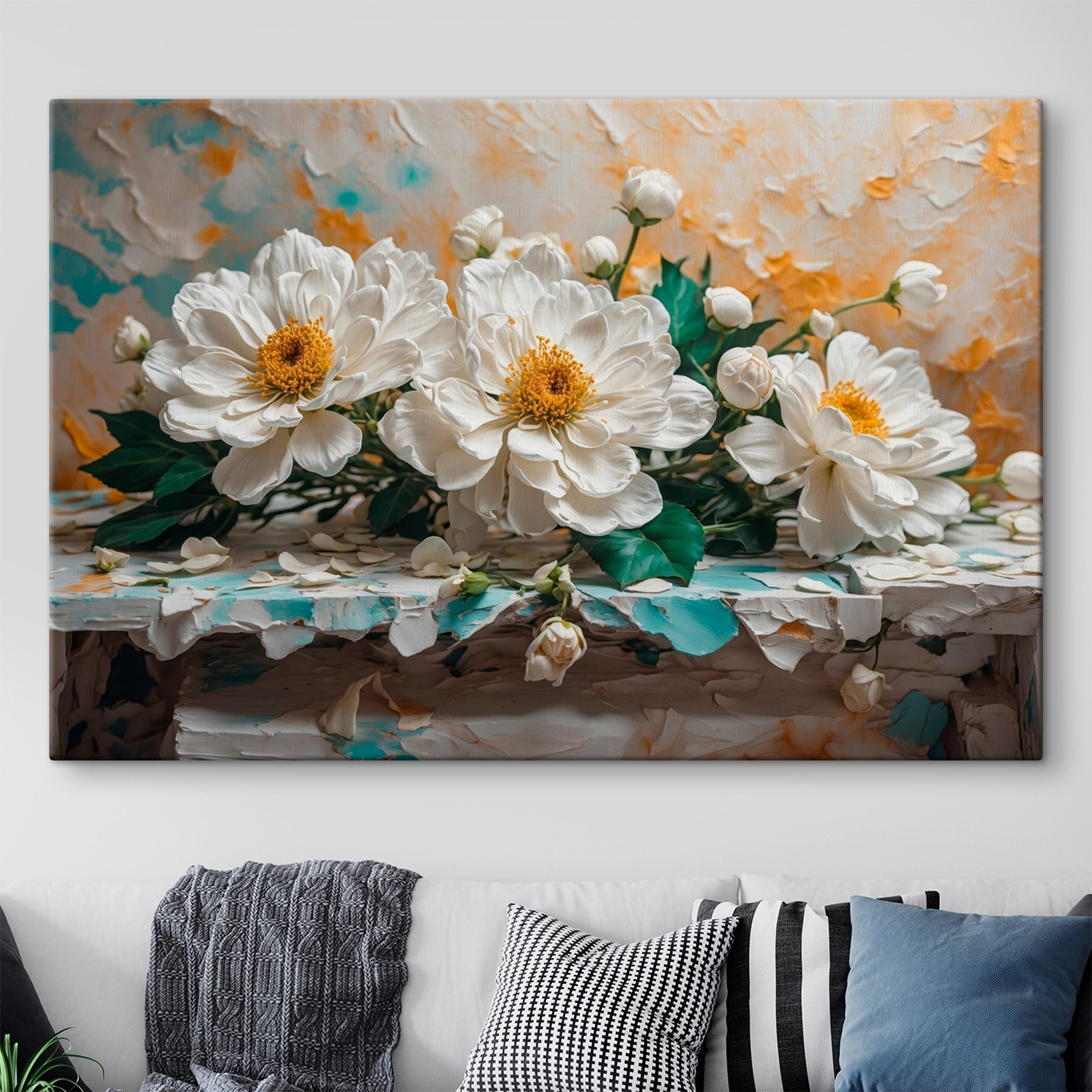 Brighten up any space with this lovely canvas print featuring a group of white flowers. It brings a sense of calm and fresh air to your walls. Imagine walking into a room and feeling like you’ve just stepped into a serene garden—soft petals and gentle colors whispering relaxation.