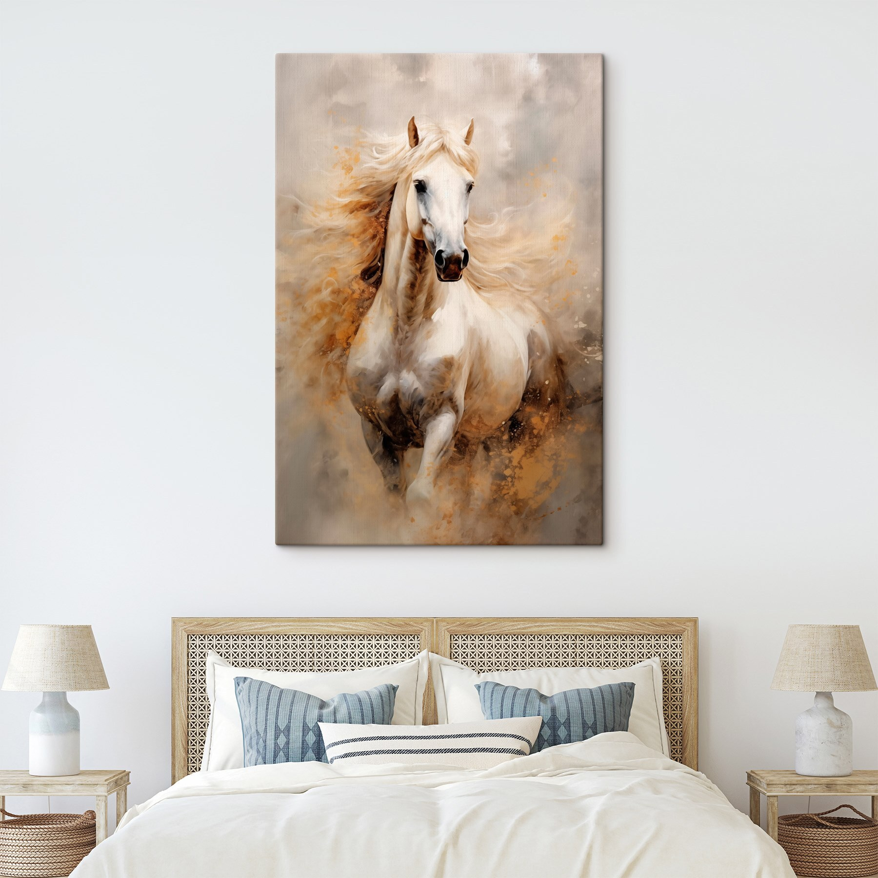Zmień swoje wnętrze dzięki temu oszałamiającemu wydrukowi na płótnie przedstawiającemu majestatycznego białego konia, którego powiewająca grzywa niemal szepcze sekrety dzikich przygód. Ten obraz nie tylko wisi na ścianie, ale także urzeka serce. Wyobraź sobie, że przechodzisz obok i rzucasz ukradkowe spojrzenia, jakby mógł wpaść galopem do Twojego salonu — a może nawet posłużyć jako idealny temat do rozmowy dla gości, którzy kochają odrobinę jeździeckiej magii. Delikatne odcienie tańczą w świetle, tworząc atmosferę jak ze snu. Odrobina elegancji, szczypta dzikiego ducha — idealne dla każdego, kto chce nadać swojemu wystrojowi odrobinę osobowości.