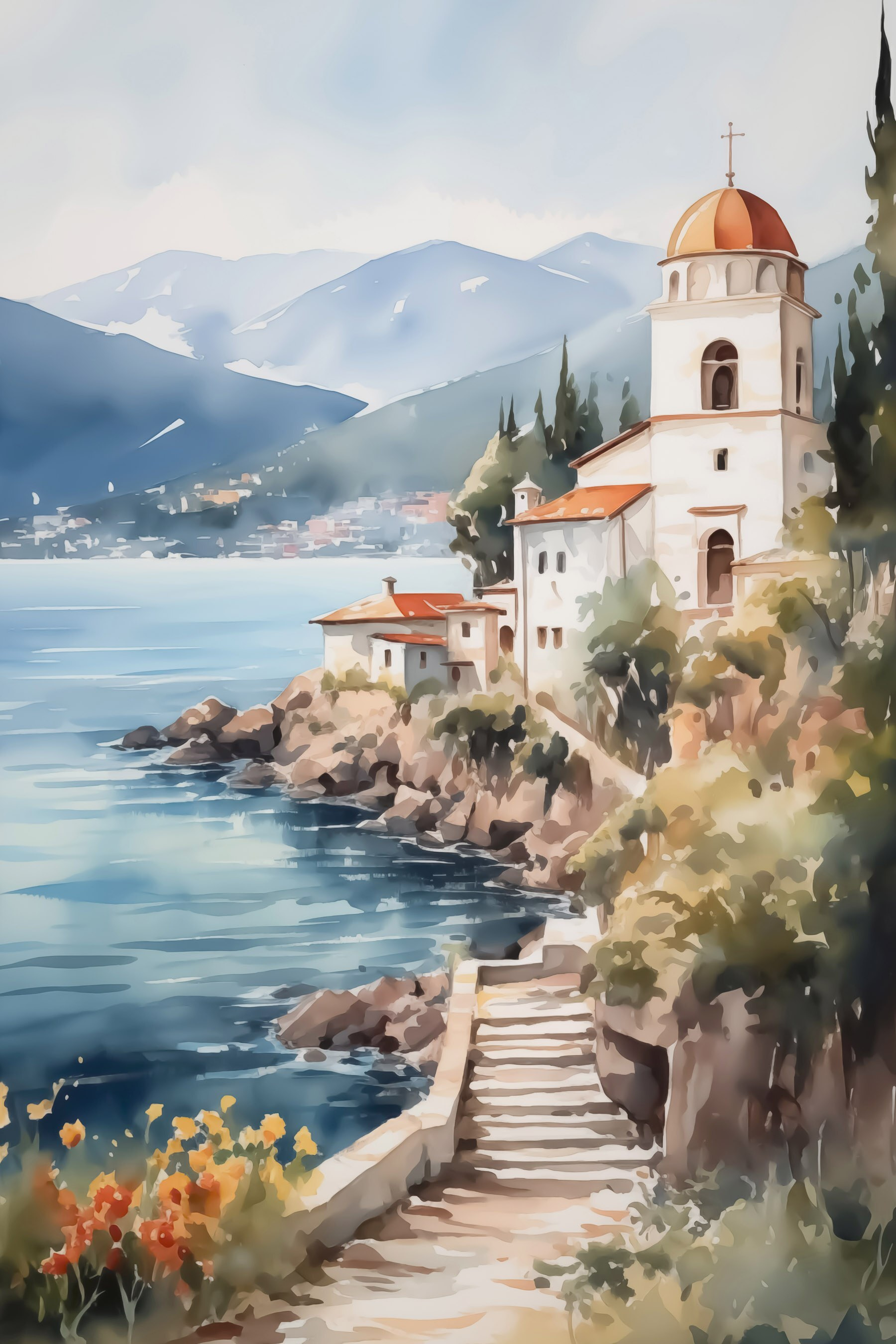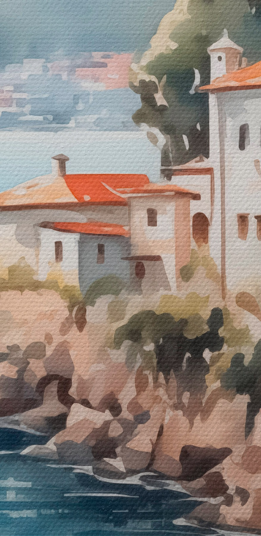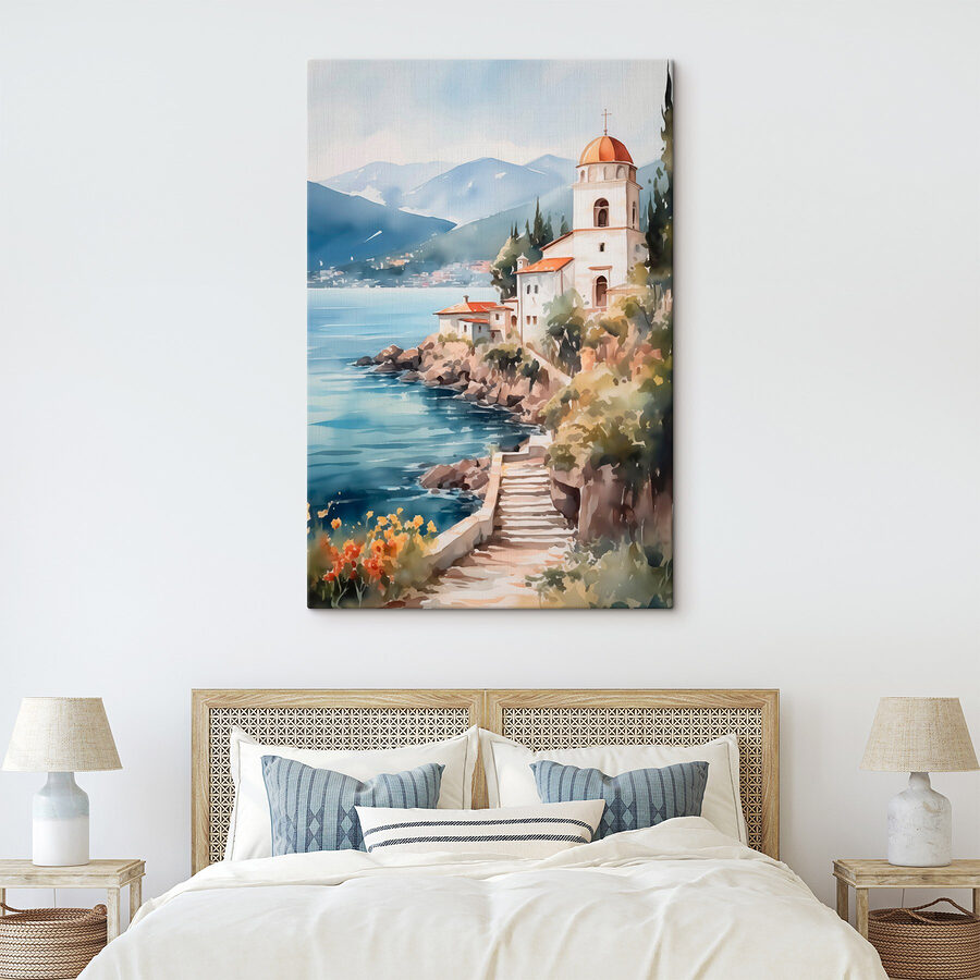 Zmień swoją ścianę w spokojną przystań dzięki tej pięknej akwareli przedstawiającej budynek na klifie nad lśniącą taflą wody. To jak wejście do świata marzeń, gdzie morska bryza szepcze sekrety, a góry stoją na straży w całej swojej okazałości. Wyobraź sobie, że wylegujesz się w swoim przytulnym kąciku, popijając ulubiony napój i zatracając się w delikatnych odcieniach i łagodnych pociągnięciach pędzla. To idealna dawka tęsknoty za podróżami, przypominająca nam o spokojnych wyprawach i słonecznych przygodach. Idealny do każdego pomieszczenia, mówi: „Życie jest zbyt krótkie, żeby nie cieszyć się widokiem!”. Przygotuj się na poważne marzenia!
