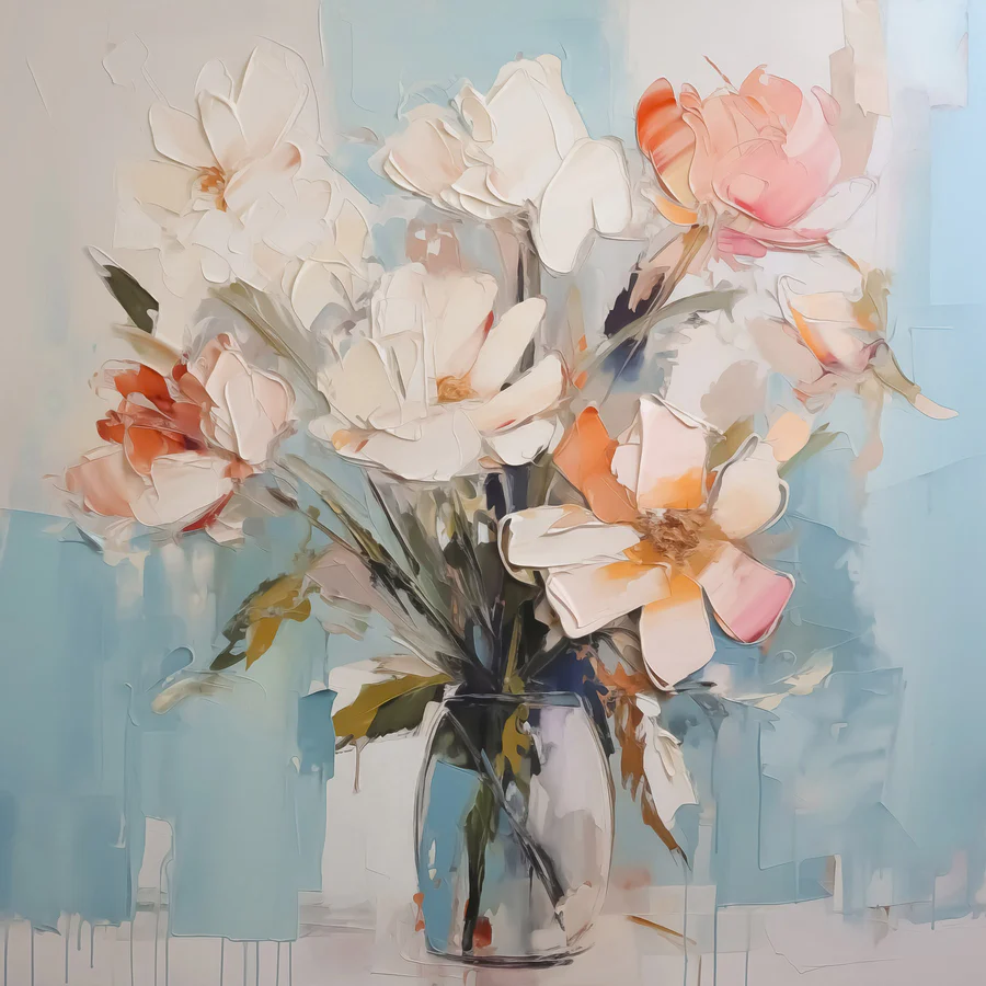 Odmień każdą przestrzeń dzięki temu żywemu obrazowi na płótnie przedstawiającemu kwiaty w wazonie. Wyobraź sobie, że wchodzisz do pokoju i witają Cię płatki i żywe kolory – to jak mały ogród witający Cię w domu. Delikatne pastele tańczą na chłodnym niebieskim tle, tworząc pogodną atmosferę. Każde spojrzenie na ten obraz może wywołać uśmiech, a nawet marzenia o słonecznych dniach. Idealny do rozjaśnienia cichego kąta lub dodania uroku przytulnemu zakątkowi, jest zachwycającym akcentem, który szepcze ciepło i urok. Któż nie pokochałby odrobiny natury we wnętrzu?
