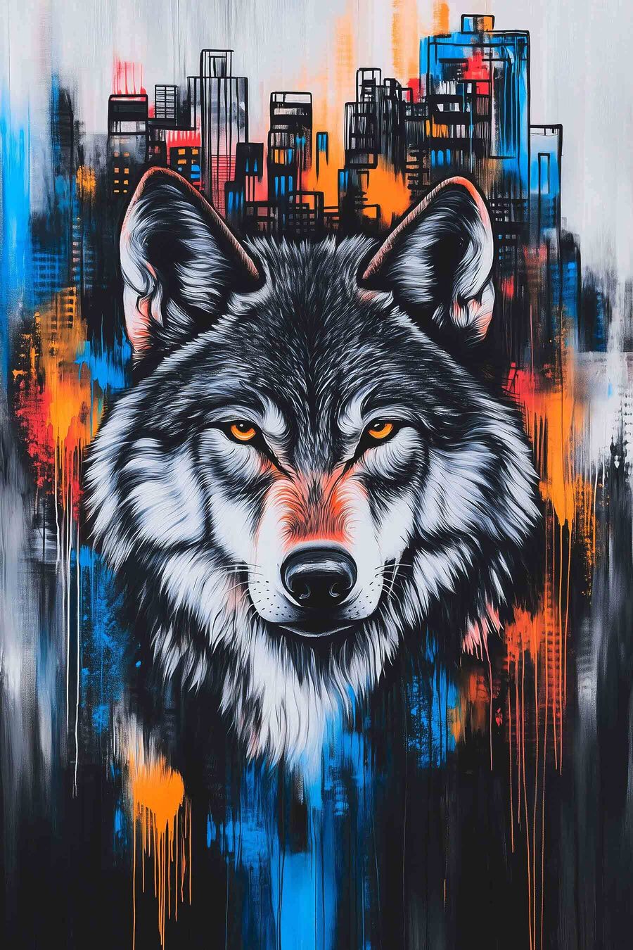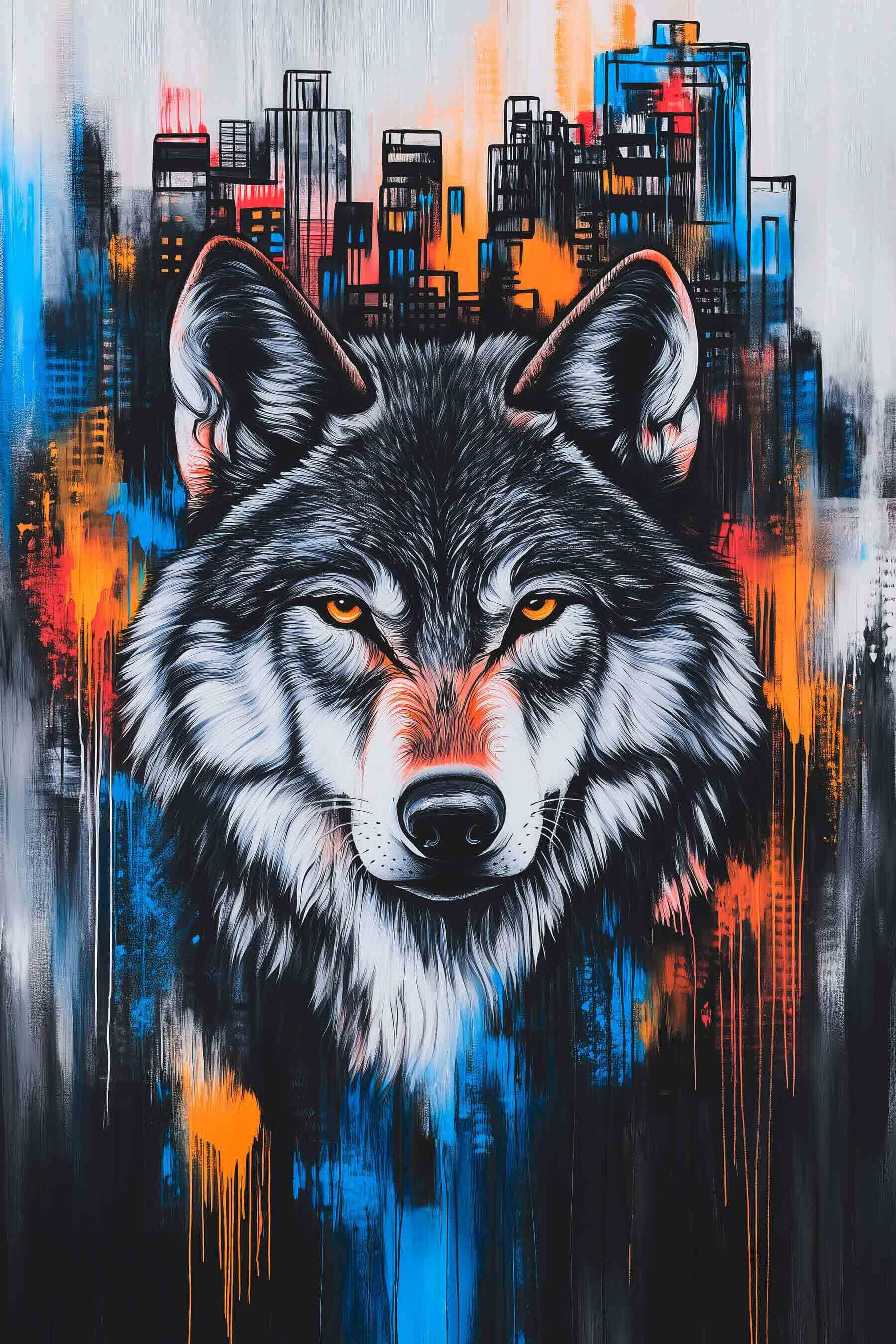 Ten efektowny wydruk na płótnie przedstawiający wilka jest jak okno na dziką przyrodę w domowym zaciszu. Dzięki swojemu zaciekłemu spojrzeniu i żywym kolorom ożywia każde pomieszczenie. Wyobraź sobie, że wchodzisz do swojego pokoju i wita Cię to majestatyczne stworzenie, które czuwa nad Tobą, gdy pijesz poranną kawę. Kontrast między miejskim tłem a intensywną ekspresją wilka opowiada historię natury spotykającej się z miejskim życiem. Ten obraz to nie tylko sztuka, ale także początek rozmowy, pobudzający ciekawość i szczyptę przygody. Idealny dla każdego, kto kocha odrobinę dzikiej natury!