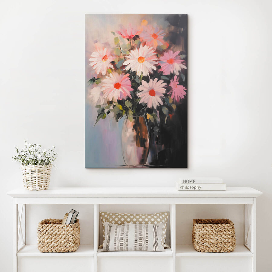 Odmień swoją przestrzeń dzięki temu wspaniałemu obrazowi na płótnie przedstawiającemu kwiaty w wazonie. To jak przeniesienie ogrodu do domu bez konieczności podlewania i pielenia! Delikatne kwiaty wyskakują na sennym tle, natychmiast podnosząc nastrój. Wyobraź sobie relaks w niedzielne popołudnie, popijając kawę i zatracając się w delikatnych kolorach, które rozjaśniają Twój salon lub sypialnię. Jest to idealne rozwiązanie dla każdego, kto kocha odrobinę natury, nawet jeśli tylko wisi na ścianie. Odrobina kwiatowego uroku i kto wie? Może po prostu rozbudzi twoje najśmielsze marzenia o ogrodnictwie – lub przynajmniej przypomni ci, aby zatrzymać się i powąchać kwiaty.
