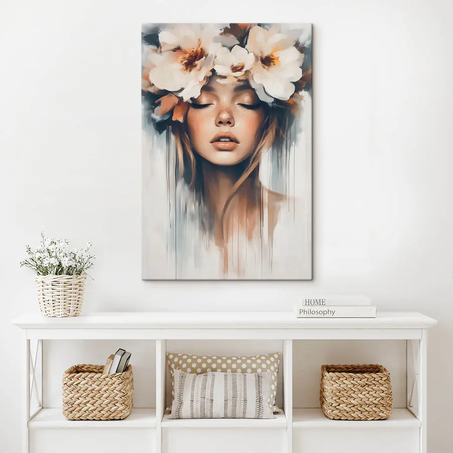 Rozjaśnij każdą przestrzeń dzięki temu urzekającemu obrazowi na płótnie “Kobieta z kwiatami we włosach”. Zaprasza on do świata, w którym natura i piękno łączą się bez wysiłku. Wyobraź sobie, że ten obraz zdobi Twój salon lub sypialnię – te delikatne kolory i marzycielski wyraz twarzy mogą pobudzić do rozmowy lub stworzyć uspokajającą atmosferę podczas relaksu po długim dniu. To jak wniesienie odrobiny słońca do wnętrza! Każde spojrzenie może przypomnieć ci o docenieniu prostych radości życia, tak jak spacer po kwitnącym ogrodzie. Idealny dla każdego, kto kocha odrobinę sztuki z sercem.