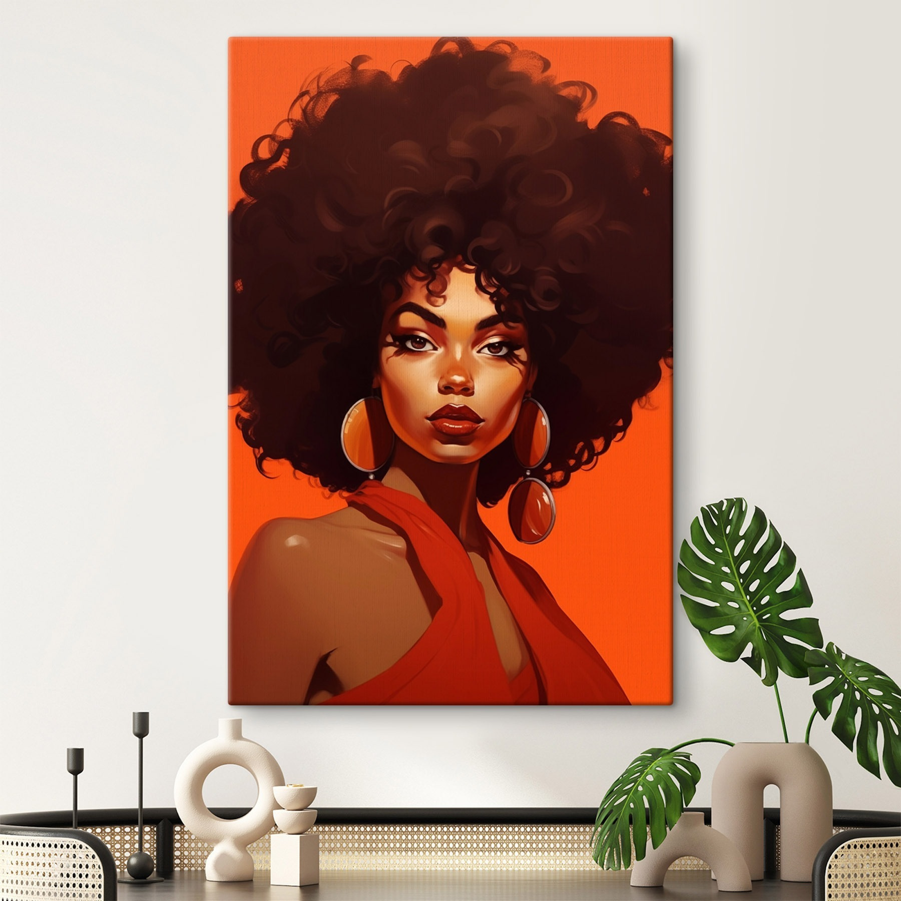 Bring a burst of personality to your space with this captivating canvas print of a woman sporting a big, curly afro and bold earrings. The rich colors and striking details make it feel alive, almost like she’s about to share a story with anyone who glances her way. Imagine having her grace your living room or home office—it’s like an instant mood booster. She radiates confidence and charm, right? Perfect for sparking conversations or just adding a fun vibe to dull walls. Trust this artwork to make any room pop. It’s not just decor; it’s a lively presence that can brighten even the gloomiest days. Plus, who doesn’t love a little extra sass in their ambiance?