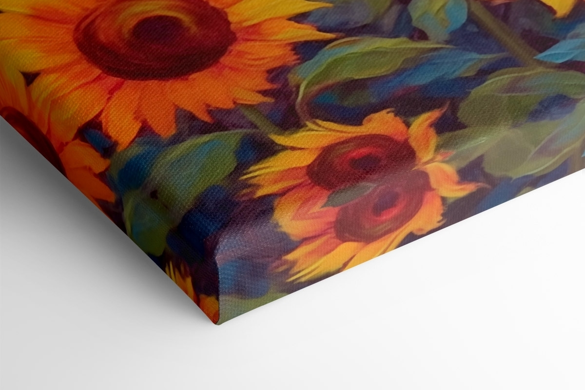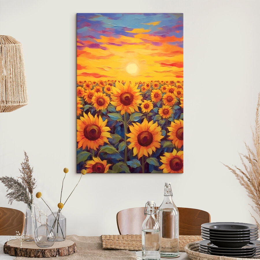 Odmień każdą przestrzeń dzięki temu żywemu obrazowi na płótnie przedstawiającemu słoneczniki wygrzewające się w złotym zachodzie słońca. Wyobraź sobie, że wkraczasz na pole, na którym te wesołe kwiaty kołyszą się delikatnie, niemal tańcząc. Każdy płatek zdaje się szeptać sekrety lata i uwierz, to poprawia nastrój. To dzieło sztuki nie tylko siedzi na ścianie – promieniuje ciepłem i radością. Idealny do rozjaśnienia nudnego kąta lub wywołania uśmiechu w przytulnej kawiarni. Poza tym, kto nie kocha słoneczników? Są jak małe, szczęśliwe twarze natury, zapraszające do środka i sprawiające, że każdy dzień wydaje się nieco bardziej słoneczny.