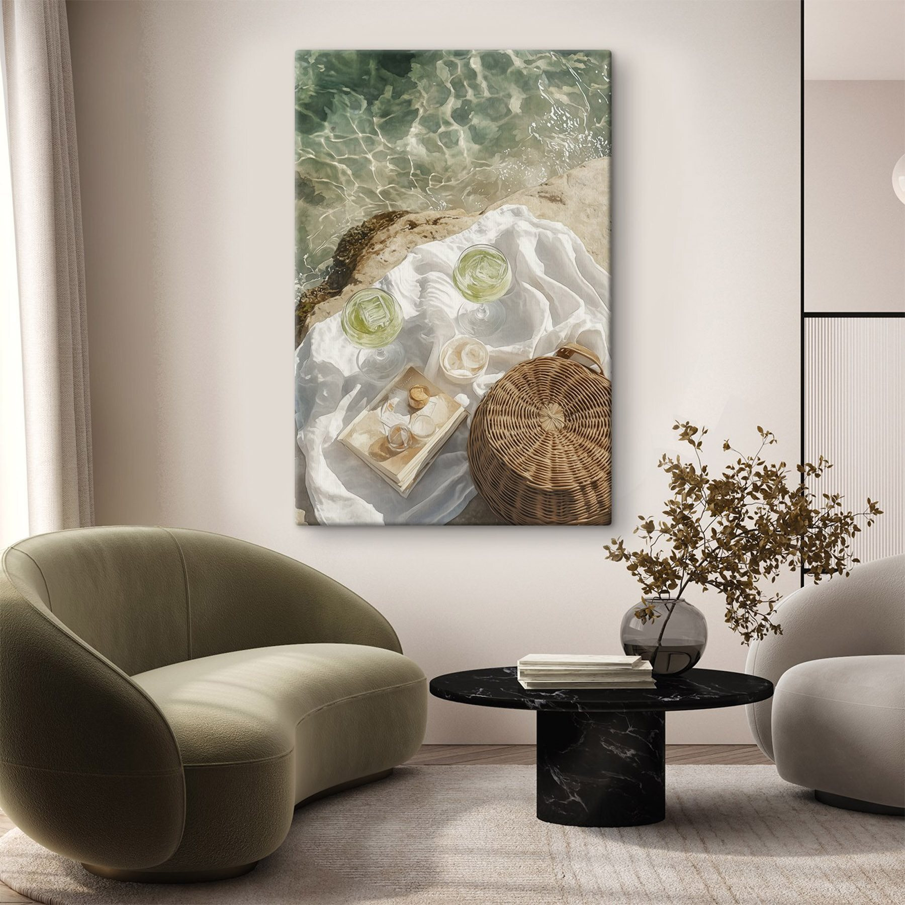 Imagine this lovely scene brightening up your space—a picnic basket and sparkling glasses of wine perched on a sun-kissed rock, with calming waters as the backdrop. It whispers lazy summer afternoons and spontaneous escapes. This canvas print effortlessly captures the essence of good times, inviting anyone who sees it to daydream about their own mini getaway. With every glance, you can almost hear laughter mingling with gentle waves.