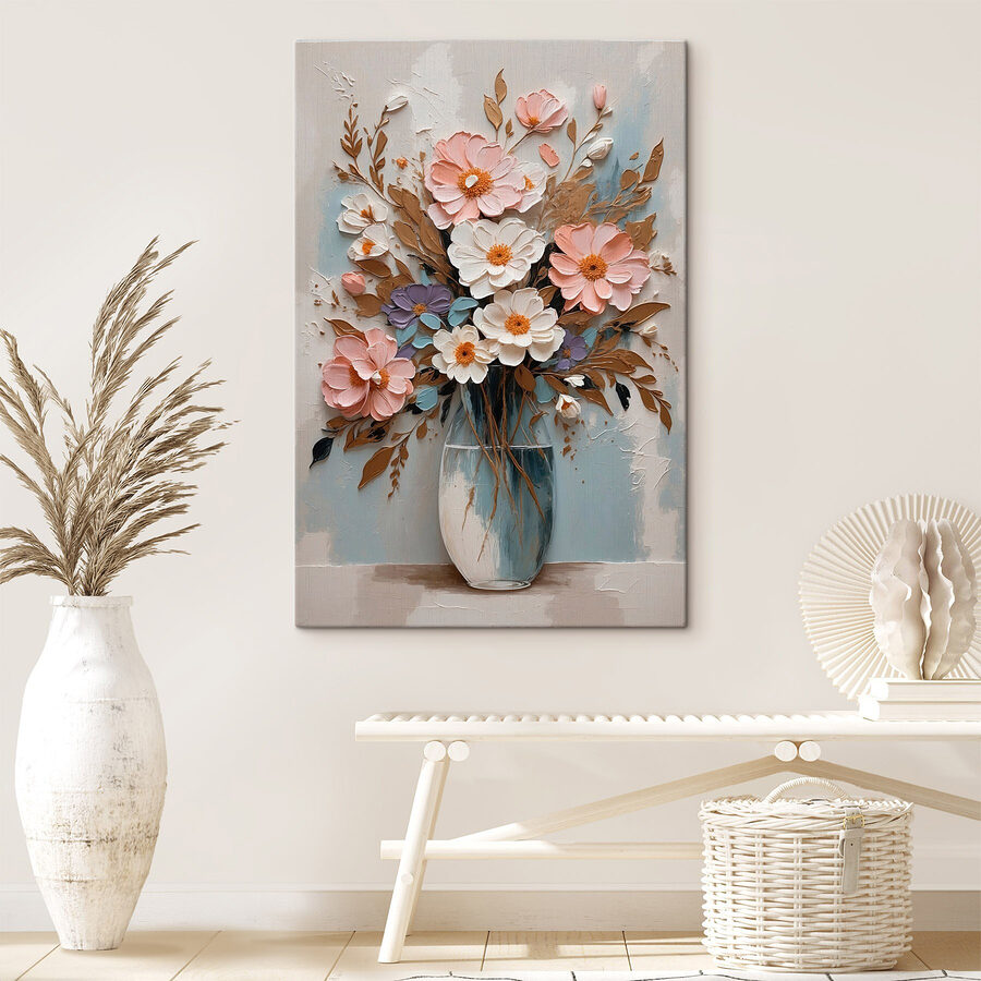 Rozjaśnij swoją przestrzeń tym żywym wydrukiem na płótnie przedstawiającym kwiaty w wazonie, uroczym dodatkiem, który krzyczy ciepłem i radością. Wyobraź go sobie nad kanapą lub w przytulnym kąciku – natychmiastowy poprawiacz nastroju, prawda? Te figlarne kwiaty, namalowane z takim polotem, wydają się delikatnie kołysać, zapraszając radość do pokoju. To jak posiadanie małego ogrodu w domu, bez uciążliwego podlewania. Przyjaciele mogą zatrzymać się, wziąć głęboki wdech i po prostu się uśmiechnąć. Idealny do dodania odrobiny osobowości do każdej ściany, ten element szepcze: “Życie jest zbyt krótkie – ciesz się pięknem!”. Daj swoim ścianom coś, o czym można porozmawiać.