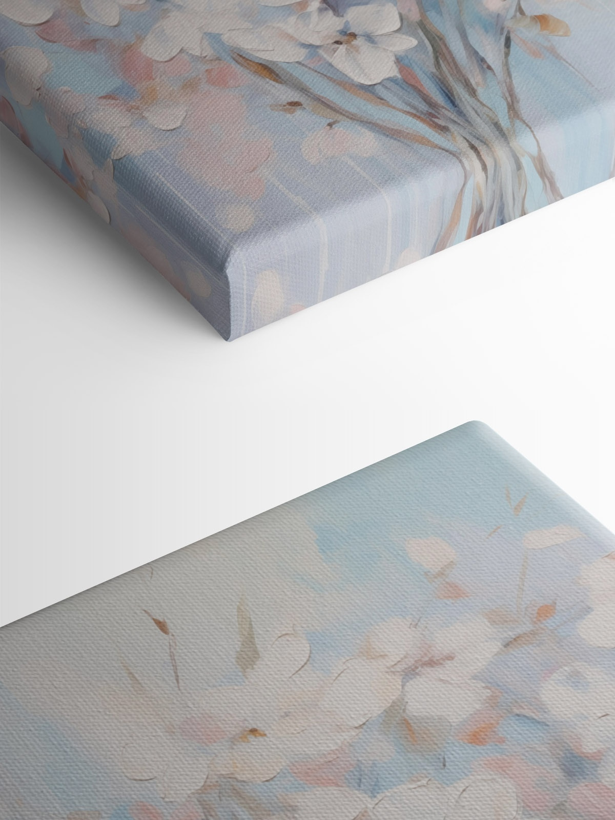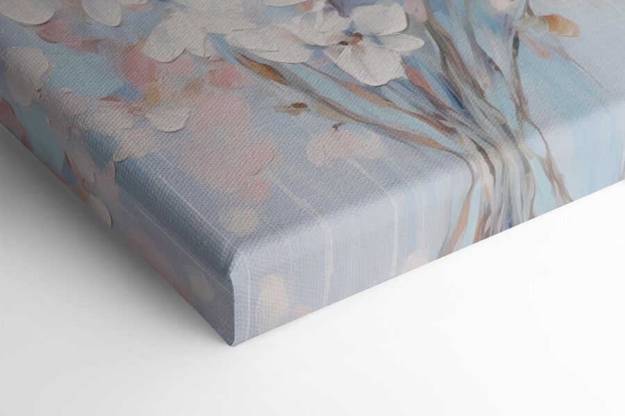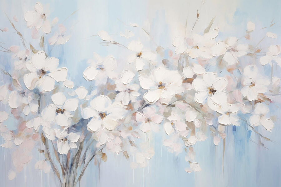 Rozjaśnij każdą przestrzeń dzięki temu wspaniałemu drukowi na płótnie przedstawiającemu delikatne białe kwiaty. Miękkie błękity i delikatne róże są jak łagodna bryza, która natychmiast poprawia nastrój w pomieszczeniu. Wyobraź sobie, że popijasz poranną kawę, podziwiając spokojne piękno sztuki, zapraszając spokój i pogodę ducha do codziennych chwil. To jak posiadanie kwitnącego ogrodu bezpośrednio na ścianie, bez uciążliwych pyłków. Idealny dla każdego, kto kocha naturę, ale może nie mieć zielonego kciuka – ten element wnosi esencję wiosny do wnętrza przez cały rok. Idealny do przytulnych zakątków lub dużych, pustych ścian, to odrobina szczęścia, która czeka, aby się wydarzyć.