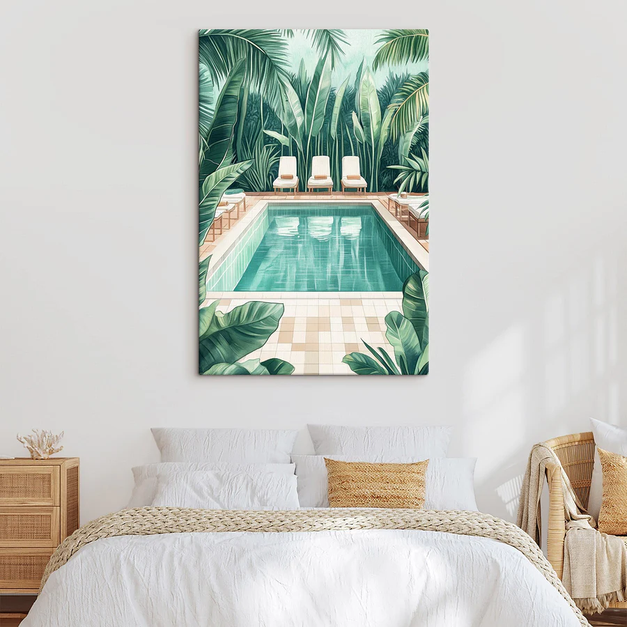 Wyobraź sobie, że wchodzisz do spokojnej oazy za każdym razem, gdy wchodzisz do pokoju. Ten urzekający wydruk na płótnie, przedstawiający spokojny basen otoczony bujną zielenią, właśnie to robi. Szepcze relaks, jak delikatna bryza w ciepły dzień. Wyobraź sobie zatopienie się w jednym z tych przytulnych leżaków, z drinkiem w ręku, podczas gdy żywe liście kołyszą się delikatnie. To kawałek raju, idealny do przekształcenia nudnej ściany w coś żywego i zachęcającego. Znajomi będą przechodzić obok i pytać: “Gdzie jest to miejsce na wakacje?”. A ty będziesz się tylko uśmiechać, bo dom też może być ucieczką.