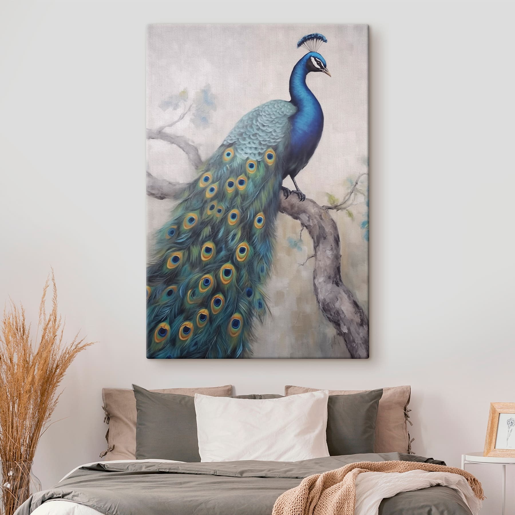 Przekształć dowolną przestrzeń w tętniące życiem miejsce dzięki temu czarującemu drukowi na płótnie przedstawiającemu pawia siedzącego z gracją na gałęzi. Oszałamiające odcienie niebieskiego i zielonego tworzą plamę koloru, która z pewnością przeniesie Cię do spokojnej oazy ogrodowej. Wyobraź sobie tego wspaniałego ptaka, który przechadza się, niemal ośmielając się, by go nie podziwiać. Idealny do salonu, biura lub przytulnego kącika do czytania, zachęca do codziennej dawki inspiracji. Poza tym, kto nie kocha odrobiny natury we wnętrzach? Doskonale oddaje elegancję dzikiej przyrody, jednocześnie nadając wystrojowi uroczy, kapryśny charakter.