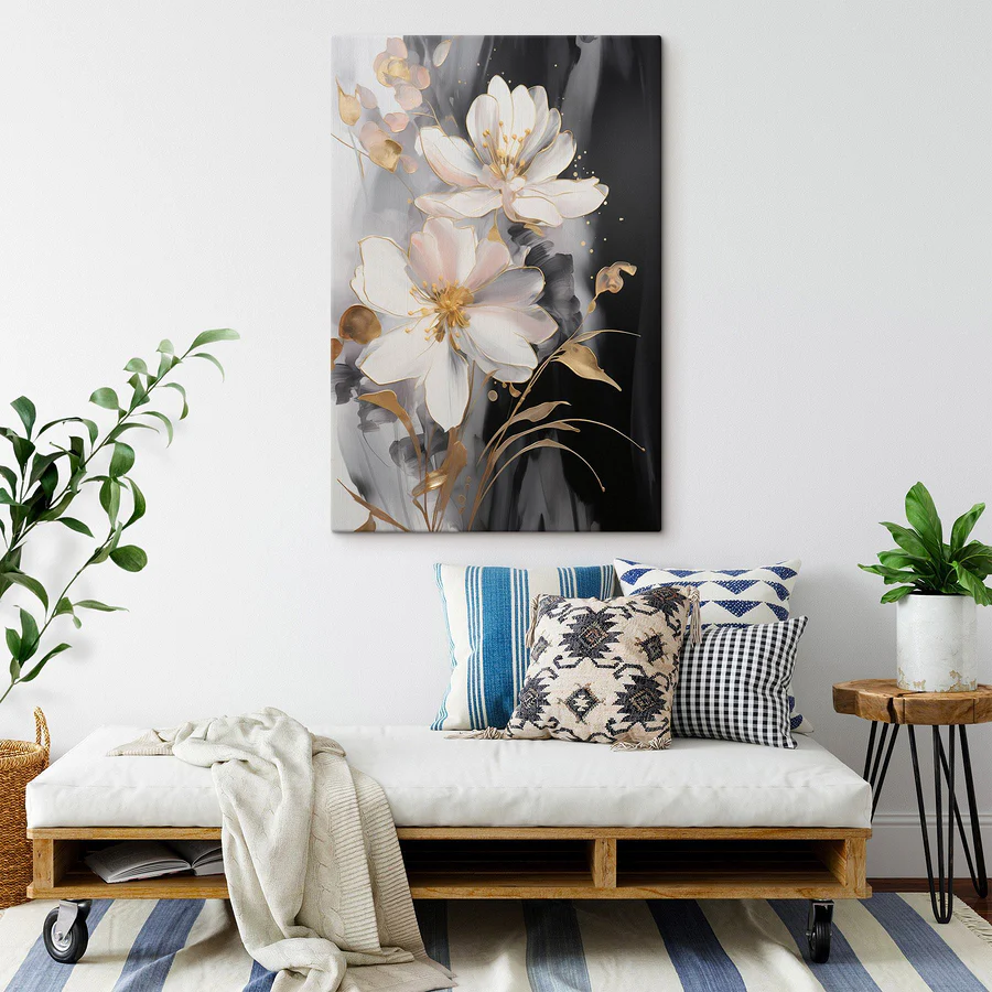 Rozjaśnij każde pomieszczenie dzięki temu wspaniałemu obrazowi na płótnie “Delicate Blooms on a Dark Canvas”. Delikatne, blade kwiaty wyskakują na głębokim tle, tworząc przytulny, ale elegancki klimat. Wyobraź sobie to arcydzieło wiszące w salonie, gdzie przyjaciele zbierają się, aby porozmawiać, może nawet przy kawie i domowych smakołykach. Dzieło ma uspokajający efekt – niczym delikatny ogród szepczący tajemnice. Każde spojrzenie może wywołać odrobinę radości lub inspiracji. Jest idealny dla każdego, kto docenia piękno natury, a kto nie kocha odrobiny botanicznego uroku, prawda? Ten przedmiot to nie tylko sztuka; to doświadczenie.