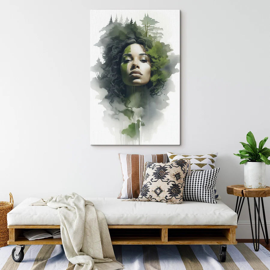 Ten wydruk na płótnie “Woman with Green Leaves on Her Face” jest jak powiew świeżego powietrza dla każdej przestrzeni. Wyobraź sobie, że wchodzisz do pokoju i zostajesz powitany przez pogodną atmosferę, która szepcze sekrety natury. Mieszanka ziemistej zieleni i delikatnych odcieni wywołuje poczucie spokoju, prawie jak delikatny szelest liści w wietrzny dzień. Idealnie nadaje się do stworzenia przytulnego kącika lub dodania intrygującego akcentu do ściany galerii.