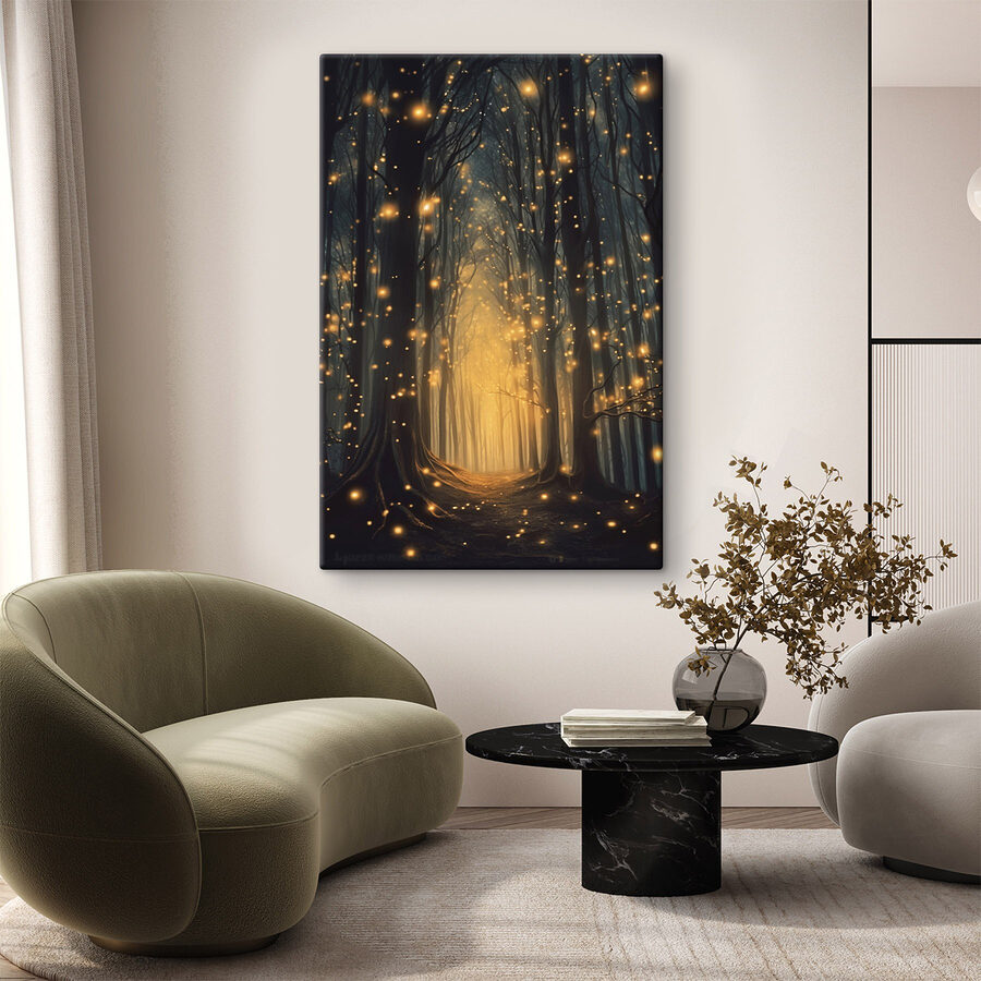Wejdź w magiczną chwilę z tym wydrukiem na płótnie “Ścieżka przez las z wieloma drzewami ze światłami”. To jak wkroczenie do bajki, w której świecące kule tryskają radością wśród wysokich drzew. Wyobraź sobie, że popijasz herbatę, podczas gdy ta grafika dodaje odrobinę cudowności do Twojego salonu. Wprowadza spokojny nastrój – idealny do przytulnych rozmów lub głębokich przemyśleń.