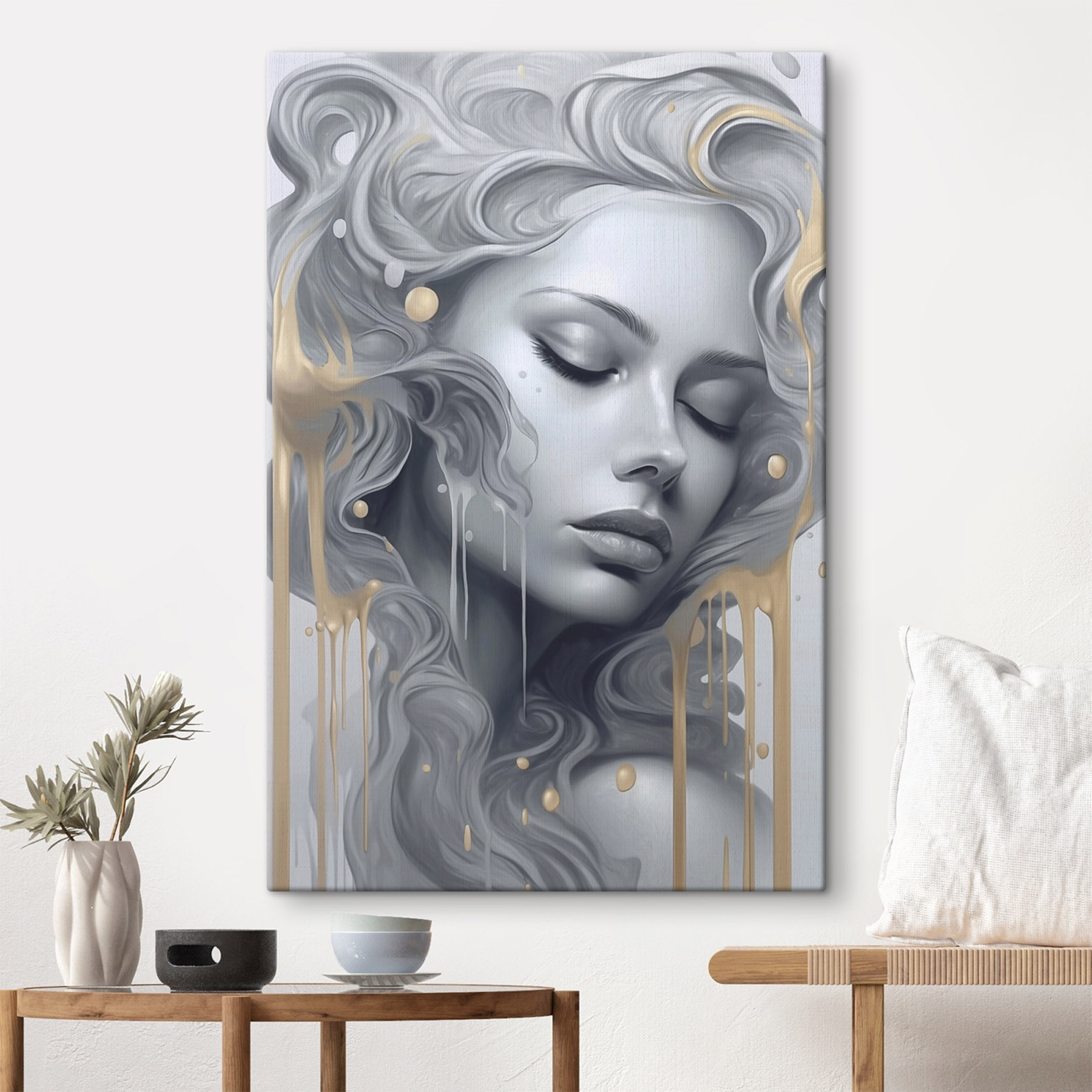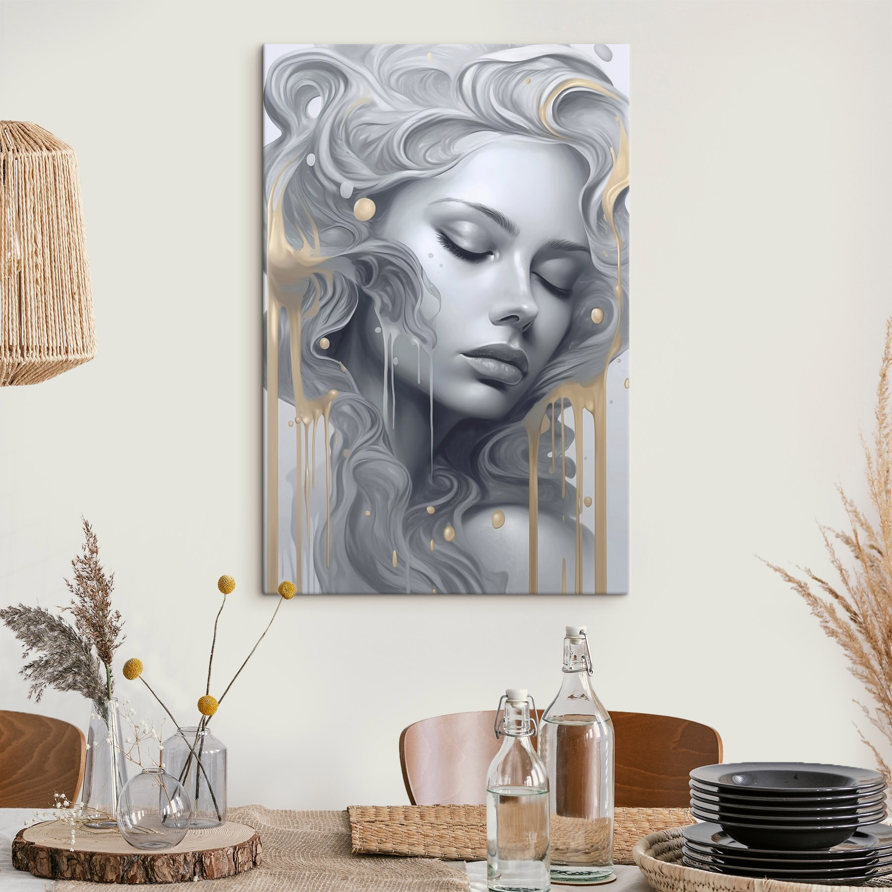 Wyobraź sobie, że wchodzisz do spokojnej przestrzeni, w której sztuka tańczy na ścianach. Ten wydruk na płótnie, przedstawiający kobietę z rozwianymi włosami, oddaje senną atmosferę, która zachęca do wyciszenia. To jak delikatny szept pośród chaosu codziennego życia. Subtelne odcienie tworzą przytulny kącik, idealny do popijania herbaty i marzeń. Wyobraź sobie, że wisi nad pluszową kanapą, rzucając zaklęcie spokoju – idealne na leniwe niedzielne popołudnia. To coś więcej niż tylko dekoracja; to kawałek spokoju, który ożywia pomieszczenie, dodając głębi i charakteru każdej przestrzeni.