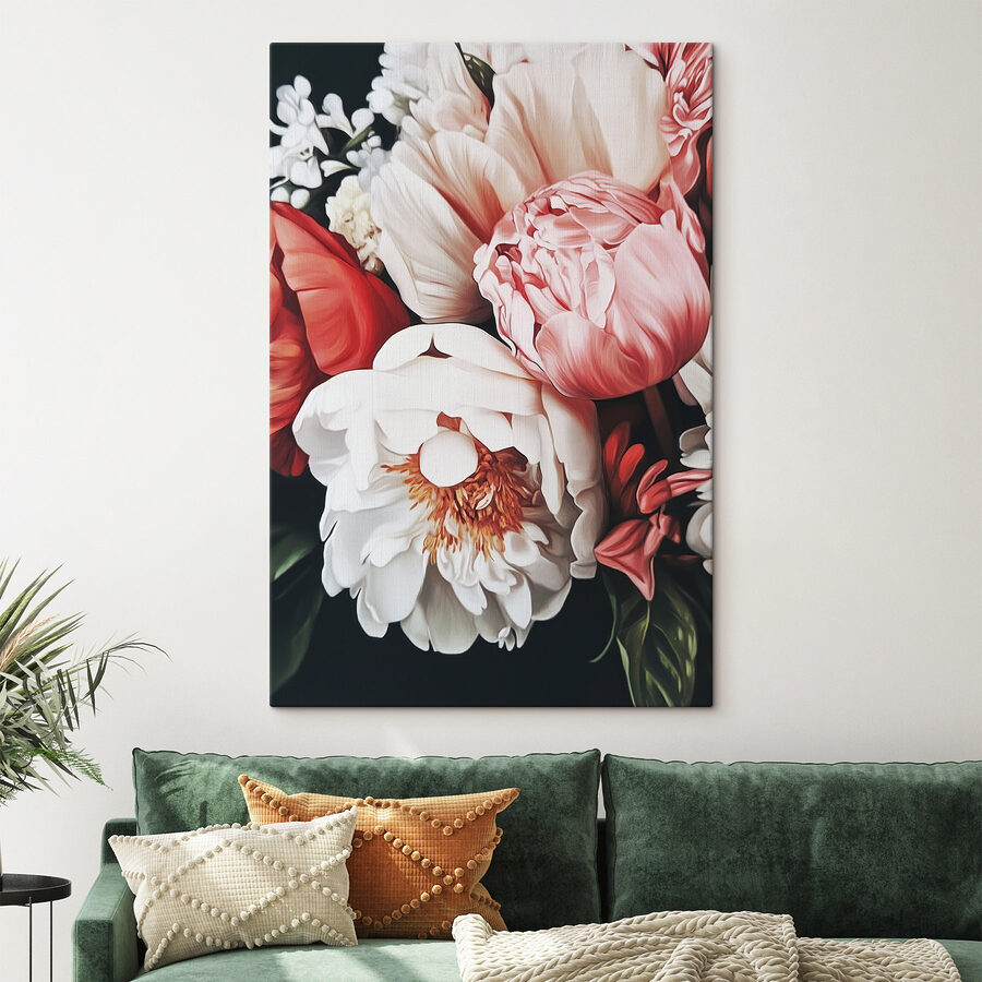 Rozjaśnij każde pomieszczenie dzięki temu wspaniałemu drukowi na płótnie przedstawiającemu żywy bukiet kwitnących kwiatów. To jak przeniesienie małego ogrodu do domu bez podlewania i pielenia. Wyobraź sobie, że spoglądasz na ten obraz podczas pracowitego dnia – każdy płatek tryska życiem i kolorem, natychmiast poprawiając nastrój. Idealny do salonu lub przytulnego kącika, w którym popijasz kawę i marzysz (lub planujesz kolejną przygodę). Znajomi będą go podziwiać, a ty przysięgniesz, że doda zupełnie nowego klimatu do twojej przestrzeni. Kto potrzebuje zielonego kciuka, gdy można mieć takie piękno na ścianie?