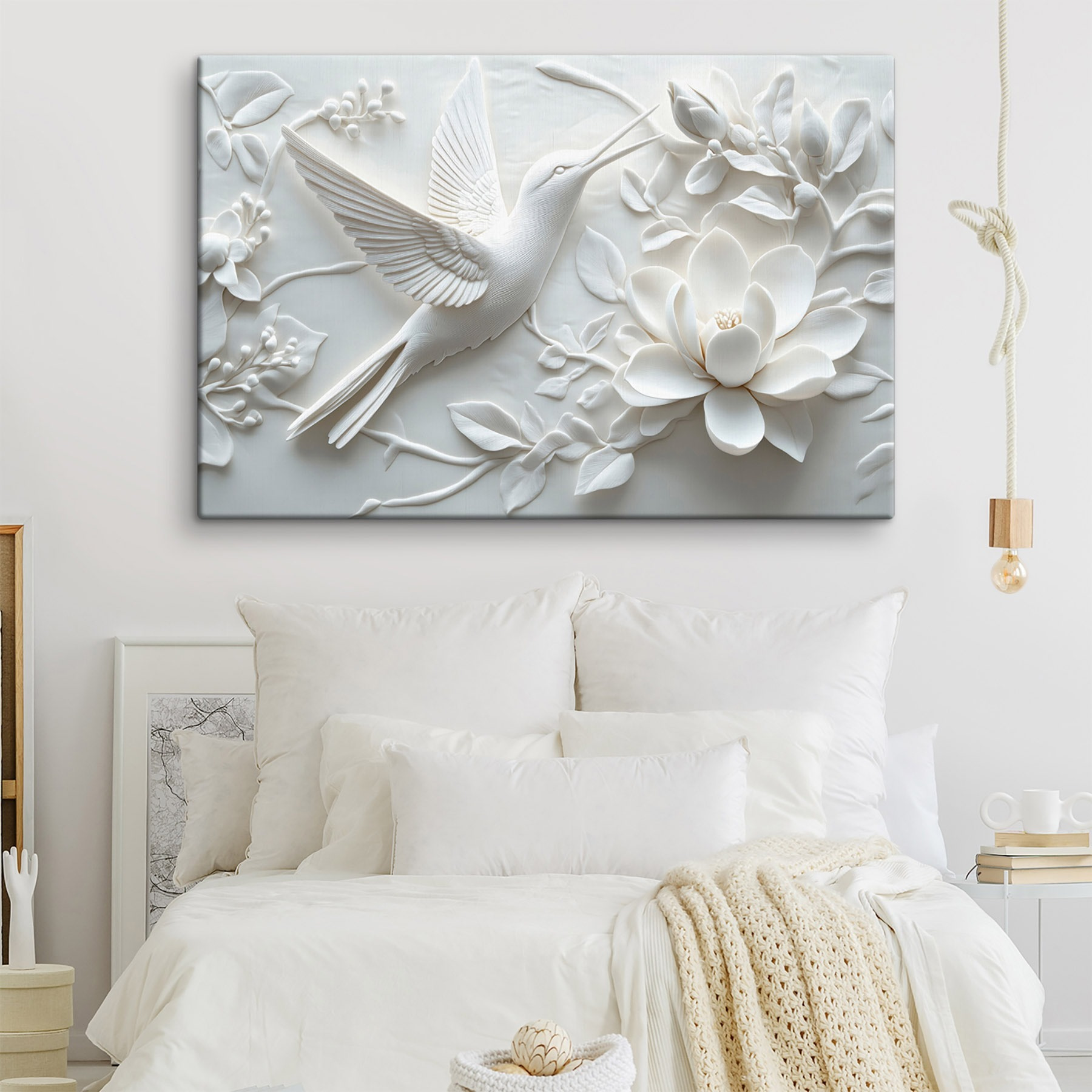 Odmień każdą przestrzeń dzięki temu czarującemu obrazowi na płótnie z wdzięcznym białym ptakiem i delikatnymi kwiatami. Wyobraź sobie, że każdego ranka budzisz się z tym spokojnym obrazem – to tak, jakbyś miał kawałek natury w swoim domu. Delikatne odcienie tworzą spokojną atmosferę, idealną do przytulnego kącika do czytania lub spokojnej sypialni.