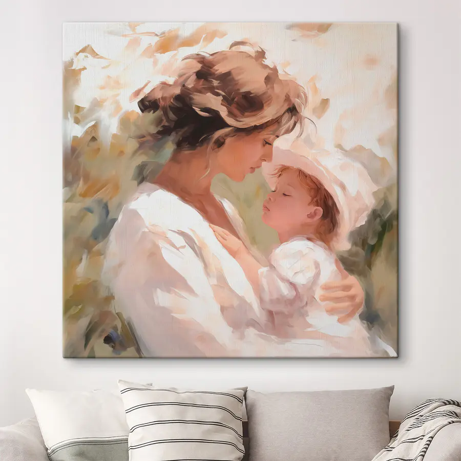 Wyobraź sobie, że wchodzisz do przytulnej przestrzeni i wita Cię to urocze płótno przedstawiające kobietę trzymającą swoje maleństwo. To jak ciepły uścisk, który natychmiast wywołuje uśmiech na twarzy. Delikatne kolory i łagodne wyrażenia uchwyciły moment wypełniony miłością i czułością. Idealny do pokoju dziecięcego lub salonu, opowiada historię bez słów. Można niemal poczuć rytm bijącego powoli serca, słodycz matczynego uścisku. To nie tylko sztuka; przynosi odrobinę ciepła, które rozjaśnia dzień. Poważnie, kto nie chciałby takiej atmosfery w domu?