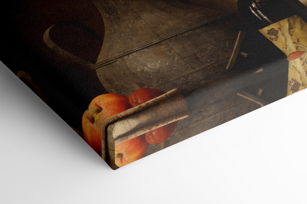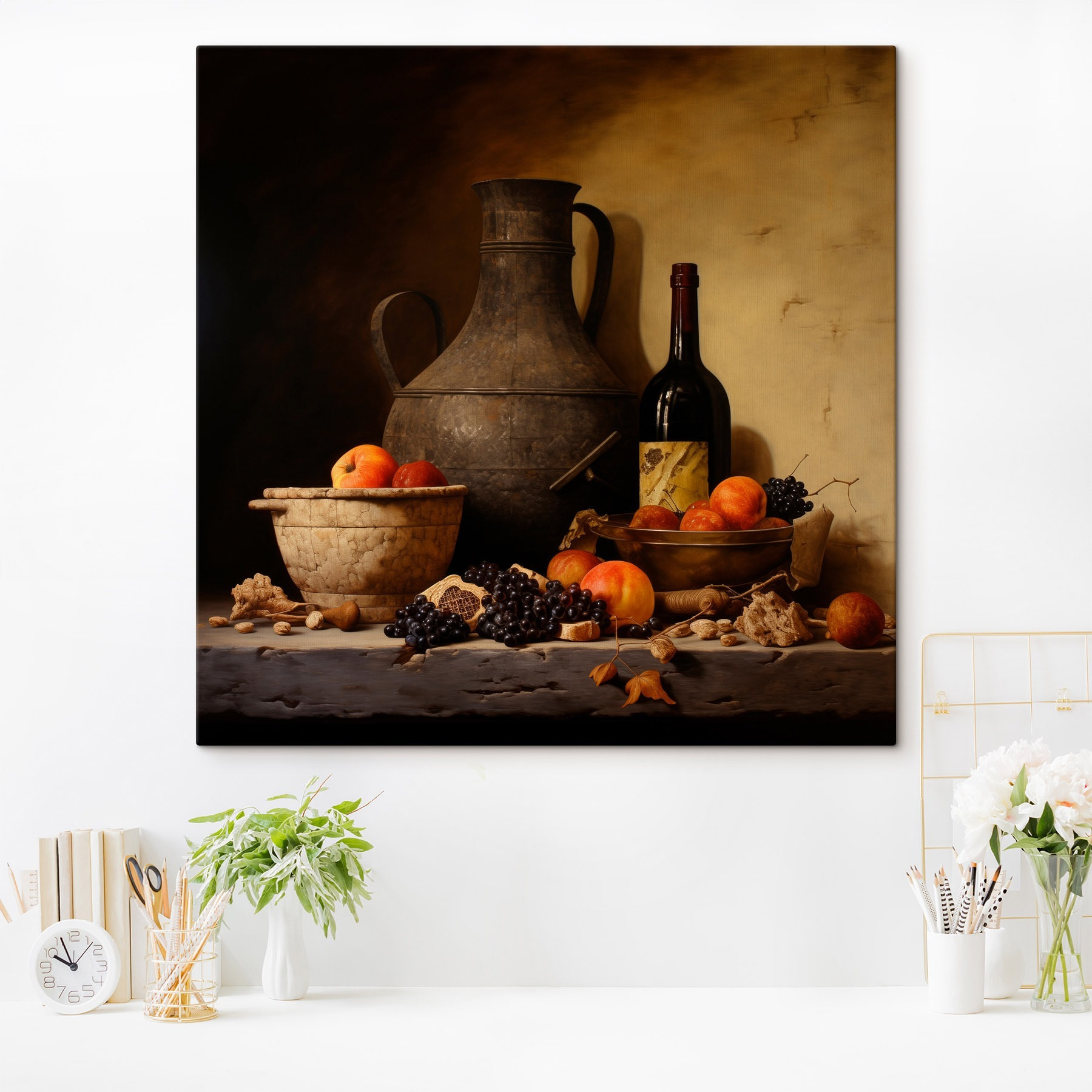 Odmień swoją przestrzeń odrobiną rustykalnego uroku. Ten druk na płótnie, przedstawiający zachwycającą martwą naturę z żywymi owocami i przytulną butelką, zachęca do ciepła i nostalgii. Wyobraź sobie ten obraz wiszący w kuchni lub jadalni, zachęcający do rozmów podczas posiłków. To jak posiadanie miniaturowego targu rolniczego w domu, bez pszczół i brudu! Ziemiste odcienie tworzą komfortową atmosferę, idealną na przytulne wieczory przy lampce wina. Idealny dla miłośników jedzenia lub każdego, kto chce dodać odrobinę życia do swoich ścian. To coś więcej niż tylko dekoracja; to doświadczenie, które czeka, aby się wydarzyć!