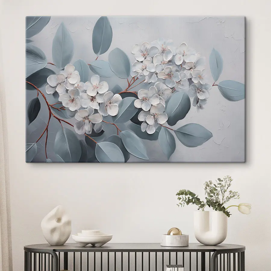 Rozjaśnij każde pomieszczenie dzięki temu pięknemu drukowi na płótnie z delikatnymi białymi kwiatami i bujnymi liśćmi. Jest to wesoły element, który wnosi odrobinę natury do wnętrza, idealny na te dni, kiedy spacer w ogrodzie wydaje się zbyt odległy. Wyobraź sobie, że wisi na ścianie, cicho zachęcając do rozmów i komplementów. Delikatne kolory tworzą uspokajającą atmosferę, dzięki czemu idealnie nadaje się do przytulnych zakątków lub rozjaśnienia przestrzeni roboczych. Ponadto jest to fantastyczny sposób na przypomnienie wszystkim, że tak, kwiaty mogą kwitnąć przez cały rok – bez bałaganu związanego z prawdziwymi płatkami.