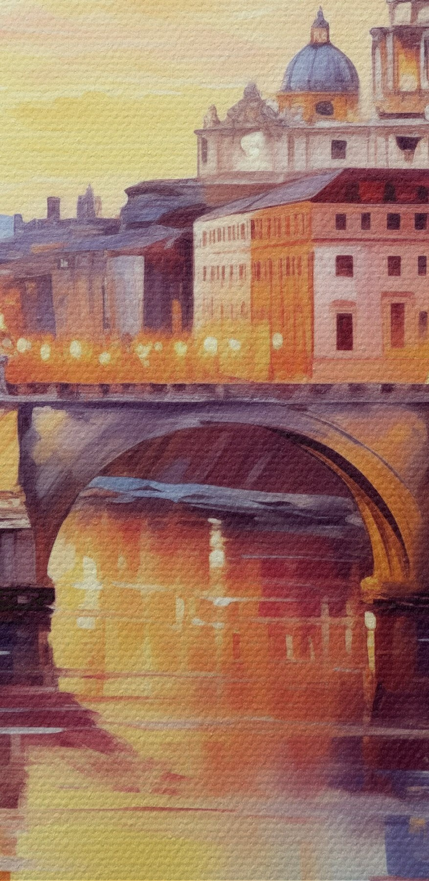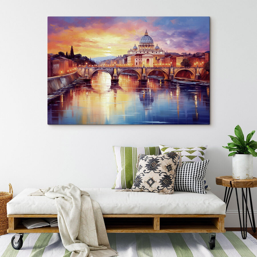 Wyobraź sobie spokojny wieczór nad rzeką z tym wspaniałym wydrukiem na płótnie, który doda ciepła i uroku każdej przestrzeni. Most z gracją rozpościera się nad wodą, odbijając odcienie zachodu słońca, podczas gdy majestatyczny budynek stoi na straży w tle. To jak zaproszenie kawałka magii podróży do swojego domu. Idealna do przytulnych zakątków lub pustej ściany błagającej o uwagę, ta grafika szepcze historie o przygodach i spokojnych chwilach. Przyjaciele mogą po prostu pozostać trochę dłużej, zagubieni w myślach, gdy będą chłonąć wspaniałą scenę. Kto nie chciałby codziennej dawki marzycielskiego eskapizmu?