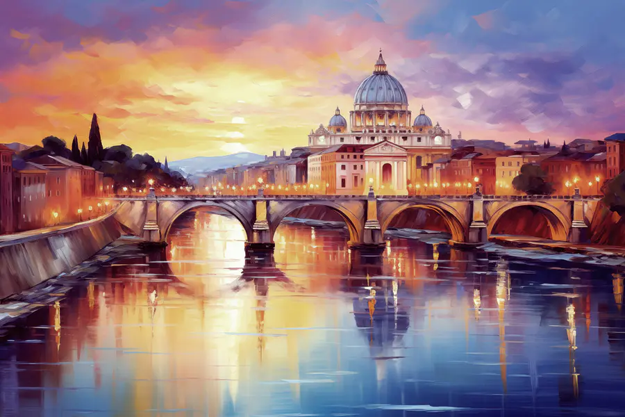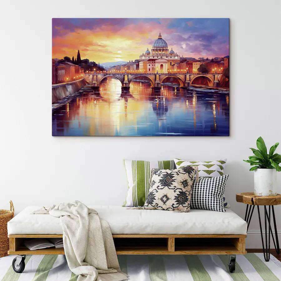 Wyobraź sobie spokojny wieczór nad rzeką z tym wspaniałym wydrukiem na płótnie, który doda ciepła i uroku każdej przestrzeni. Most z gracją rozpościera się nad wodą, odbijając odcienie zachodu słońca, podczas gdy majestatyczny budynek stoi na straży w tle. To jak zaproszenie kawałka magii podróży do swojego domu. Idealna do przytulnych zakątków lub pustej ściany błagającej o uwagę, ta grafika szepcze historie o przygodach i spokojnych chwilach. Przyjaciele mogą po prostu pozostać trochę dłużej, zagubieni w myślach, gdy będą chłonąć wspaniałą scenę. Kto nie chciałby codziennej dawki marzycielskiego eskapizmu?