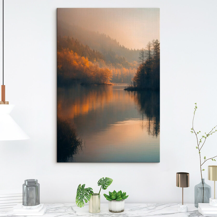 Wyobraź to sobie: spokojne jezioro, otoczone szumiącymi drzewami i majestatycznymi górami, jakby natura namalowała arcydzieło specjalnie dla Ciebie. Ten wydruk na płótnie nie tylko siedzi na ścianie; zachęca do wzięcia głębokiego oddechu i poczucia spokoju. Ciepły blask zachodzącego słońca tańczy na wodzie, sprawiając, że trudno nie marzyć o leniwych popołudniach spędzonych nad rzeką. Idealny do przytulnego kącika lub salonu, który pragnie odrobiny wspaniałego wypoczynku na świeżym powietrzu. To jak przeniesienie kawałka spokoju prosto do domu. Kto by tego nie chciał?