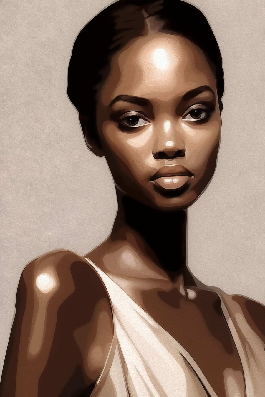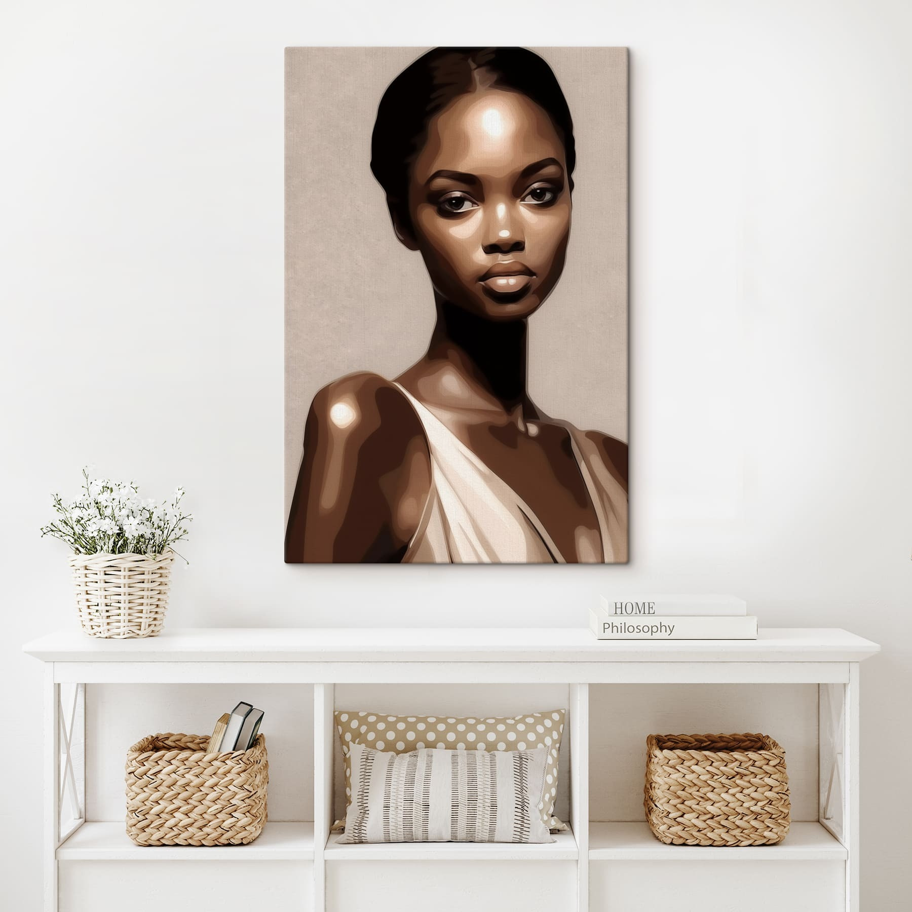 Wprowadź odrobinę elegancji do swojej przestrzeni dzięki temu efektownemu wydrukowi na płótnie. Przedstawiająca kobietę w prostym białym podkoszulku i ciemnych włosach, jej spojrzenie przyciąga wzrok, prawie tak, jakby miała sekret do podzielenia się. Wyobraź sobie ten obraz wiszący w Twoim salonie, pobudzający do rozmów podczas spotkań lub po prostu zapewniający chwilę spokoju, gdy tego potrzebujesz. Subtelne odcienie bez wysiłku łączą się z różnymi stylami wystroju, dzięki czemu jest to wszechstronny wybór. Idealny dla tych, którzy cenią sztukę, która opowiada historię – za każdym razem, gdy na nią spojrzysz, możesz znaleźć nowy szczegół, który przyciągnie twój wzrok. To jak posiadanie dobrego przyjaciela w pobliżu, zawsze tam, aby rozjaśnić swój dzień.
