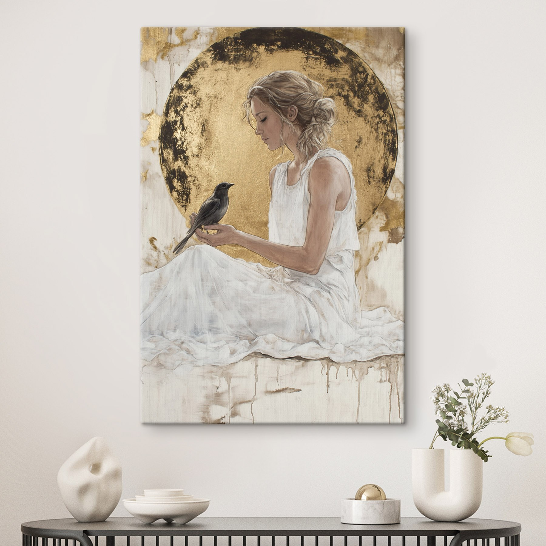 Wyobraź sobie, że ten uroczy wydruk na płótnie wprowadzi odrobinę spokojnego piękna do Twojej przestrzeni. Kobieta w zwiewnej białej sukni tuli małego ptaszka, tworząc moment, który jest zarówno delikatny, jak i ponadczasowy. To jak przebłysk spokojnego snu, w którym natura i ludzkość pięknie się przeplatają. Zawieś go w przytulnym kącie lub nad kącikiem do czytania, a możesz po prostu śnić za każdym razem, gdy przechodzisz obok. Dodatkowo, dodaje on ciepłej, zachęcającej atmosfery – idealnej do rozpoczęcia głębokich rozmów przy kawie lub herbacie. To dopiero początek rozmowy!