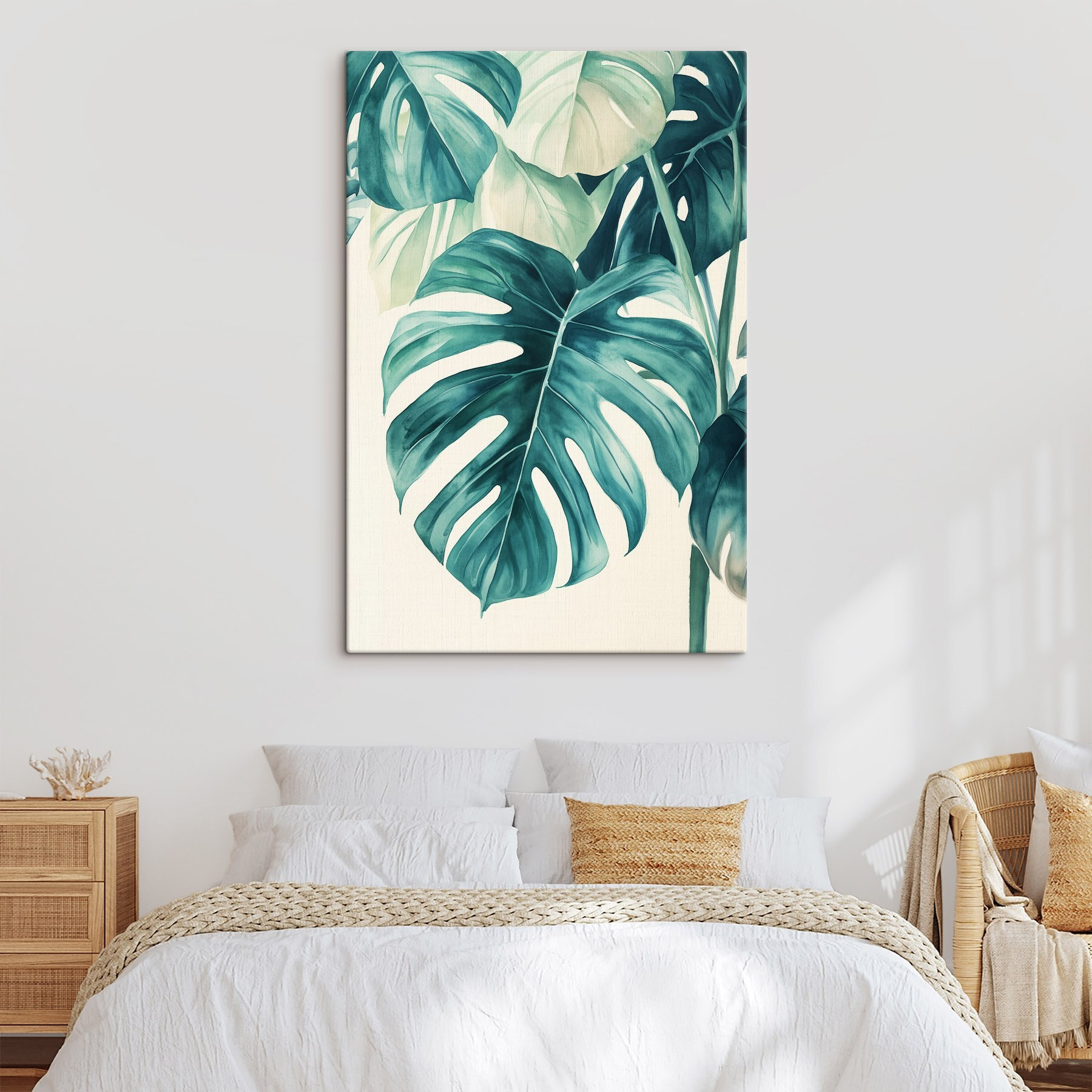 Przekształć dowolną ścianę w spokojną oazę dzięki temu żywemu obrazowi na płótnie przedstawiającemu tropikalne liście. To jak przeniesienie kawałka lasu deszczowego prosto do salonu – oczywiście bez wilgoci. Wyobraź sobie, że wylegujesz się na kanapie, popijasz kawę i czujesz się jak na mini-wycieczce. Bogata zieleń i delikatne odcienie tworzą spokojną atmosferę, która sprawia, że wszystko staje się nieco jaśniejsze. Idealny dla tych, którzy cenią naturę, ale mogą nie mieć zielonego kciuka. Połącz go z innymi dziełami sztuki lub pozwól mu stać samodzielnie; tak czy inaczej, z pewnością wywoła radość, a może nawet marzenia o tropikalnych przygodach!