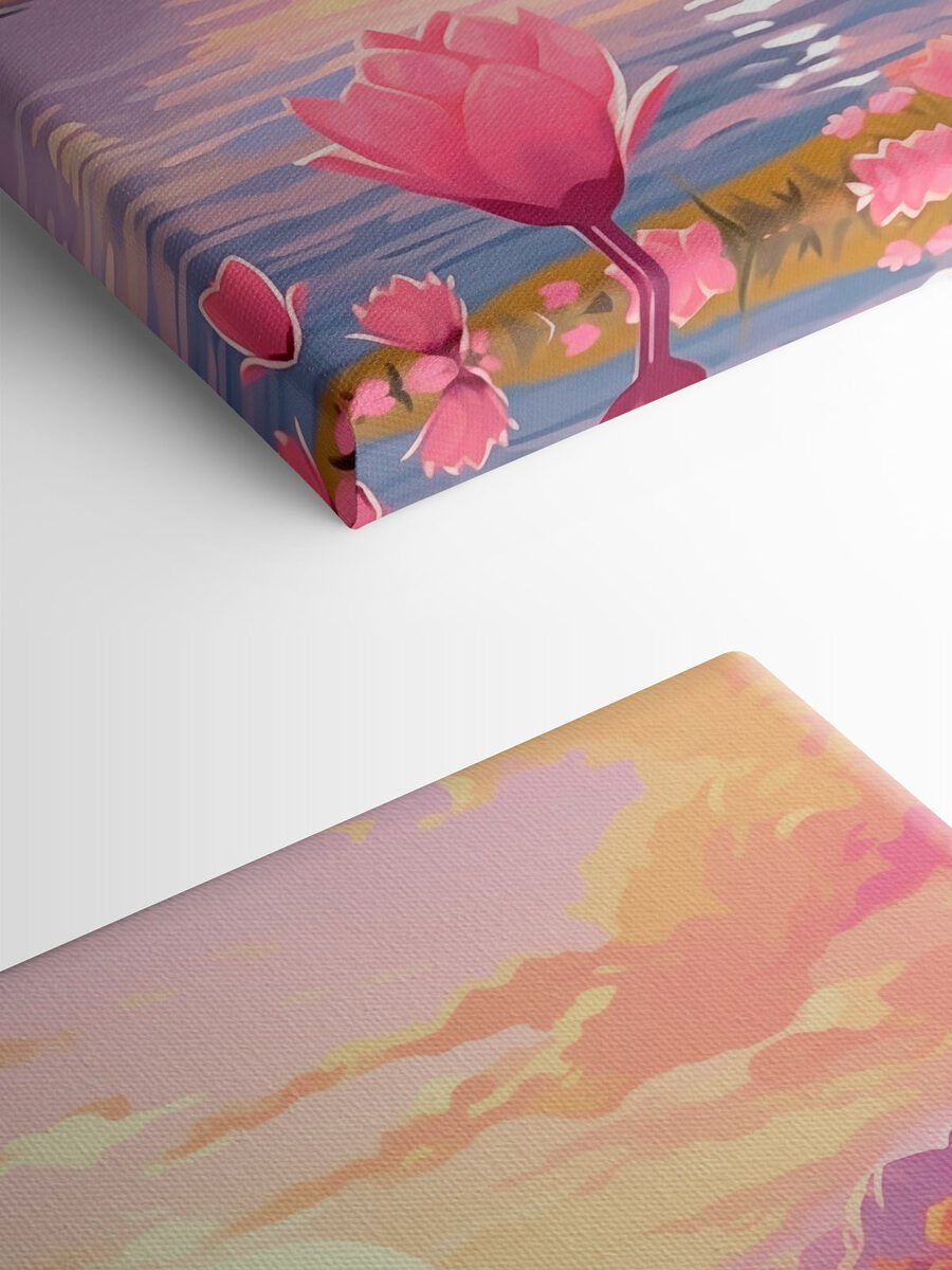 Wyobraź sobie, że wchodzisz do pomieszczenia i wita Cię oszałamiający widok różowych kwiatów tańczących nad spokojnym jeziorem. Ten wydruk na płótnie oddaje ten idealny moment, w którym natura spotyka się ze sztuką, zachęcając do poczucia spokoju i radości. Delikatne odcienie zachodu słońca malują niebo, odbijając się na wodzie jak magia. To jak przeniesienie kawałka raju do wnętrza. Idealny do przytulnego kącika do czytania lub nawet nad stołem w jadalni, ten element pobudza marzenia i spokojne wibracje. To coś więcej niż tylko dekoracja; to mały kawałek spokoju bezpośrednio na ścianie. Pomyśl tylko – za każdym razem, gdy na nią spojrzysz, ogarnie Cię fala spokoju. To jest coś, na czym warto zawiesić oko.