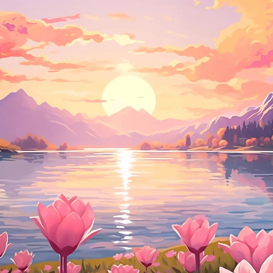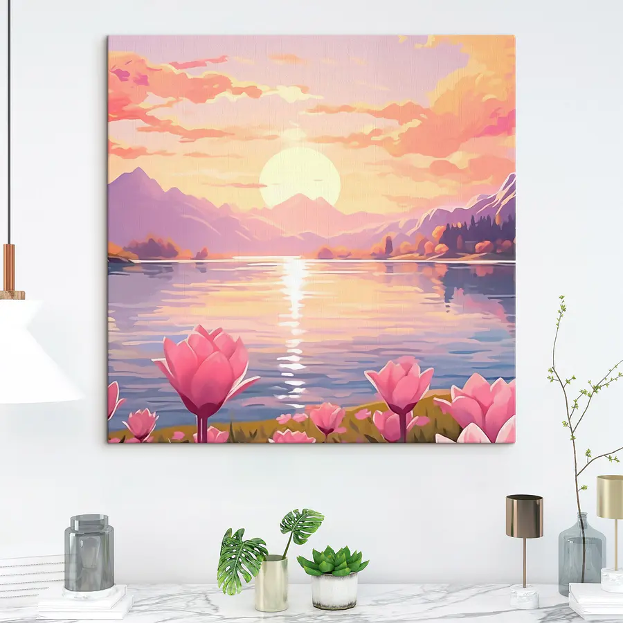 Wyobraź sobie, że wchodzisz do pomieszczenia i wita Cię oszałamiający widok różowych kwiatów tańczących nad spokojnym jeziorem. Ten wydruk na płótnie oddaje ten idealny moment, w którym natura spotyka się ze sztuką, zachęcając do poczucia spokoju i radości. Delikatne odcienie zachodu słońca malują niebo, odbijając się na wodzie jak magia. To jak przeniesienie kawałka raju do wnętrza. Idealny do przytulnego kącika do czytania lub nawet nad stołem w jadalni, ten element pobudza marzenia i spokojne wibracje. To coś więcej niż tylko dekoracja; to mały kawałek spokoju bezpośrednio na ścianie. Pomyśl tylko – za każdym razem, gdy na nią spojrzysz, ogarnie Cię fala spokoju. To jest coś, na czym warto zawiesić oko.