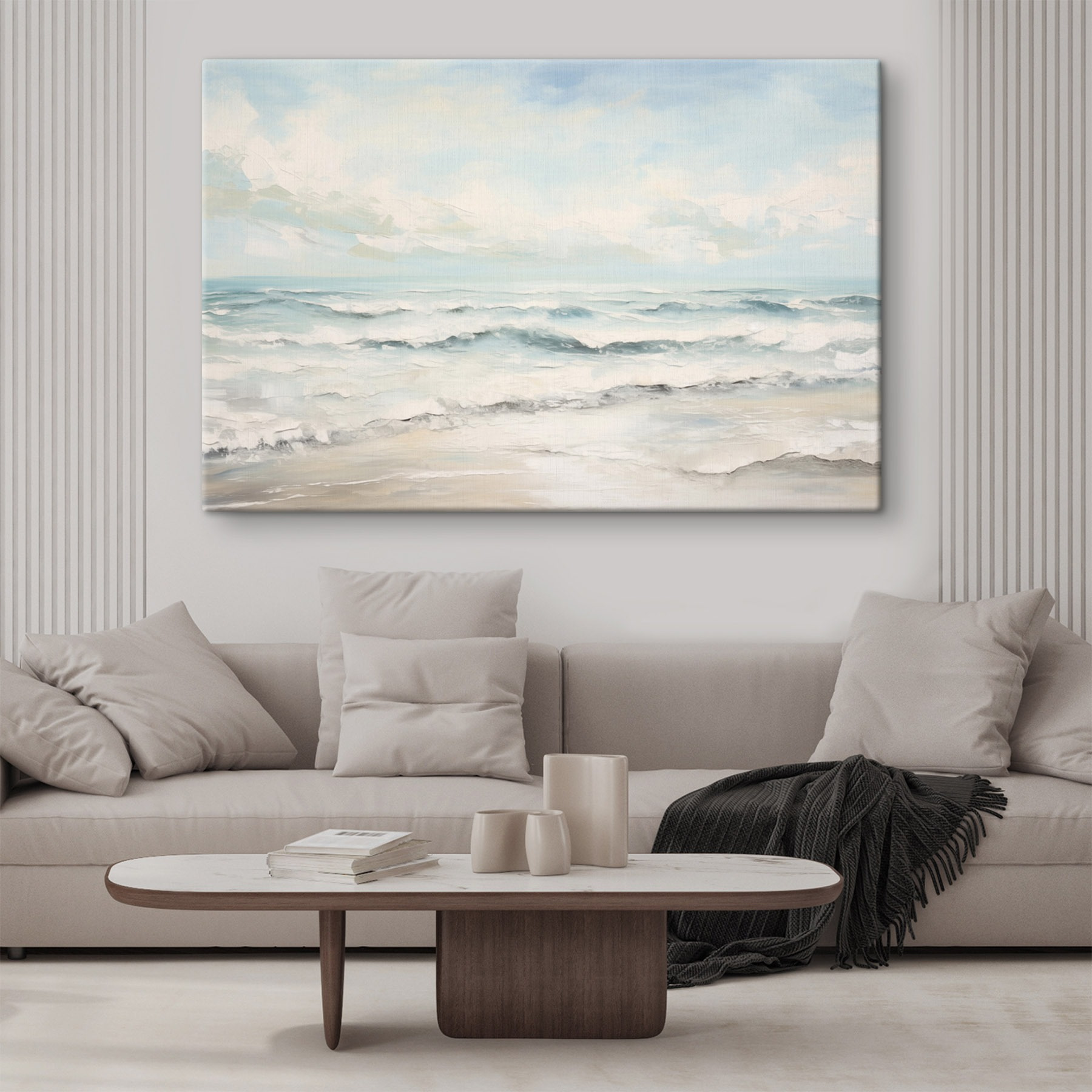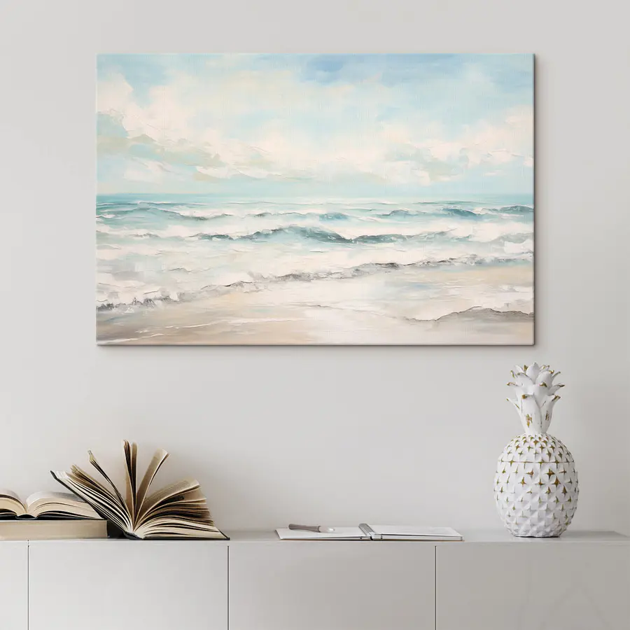 Wnieś odrobinę plaży do swojego domu dzięki temu wspaniałemu obrazowi na płótnie przedstawiającemu fale tańczące na brzegu. Wyobraź sobie te delikatne dźwięki uderzenia i słoną bryzę za każdym razem, gdy spojrzysz na to piękno – to jak mini wakacje dla twoich oczu. Delikatne błękity i biele tworzą spokojną atmosferę, sprawiając, że każda przestrzeń wydaje się przestronna i lekka. Idealny do salonu, sypialni, a nawet przytulnego kącika do czytania, z pewnością wywoła senne rozmowy. Poza tym, kto nie chciałby przypomnieć sobie leniwych dni na plaży? Powieś go, rozsiądź się wygodnie i daj się ponieść dobrym wibracjom!