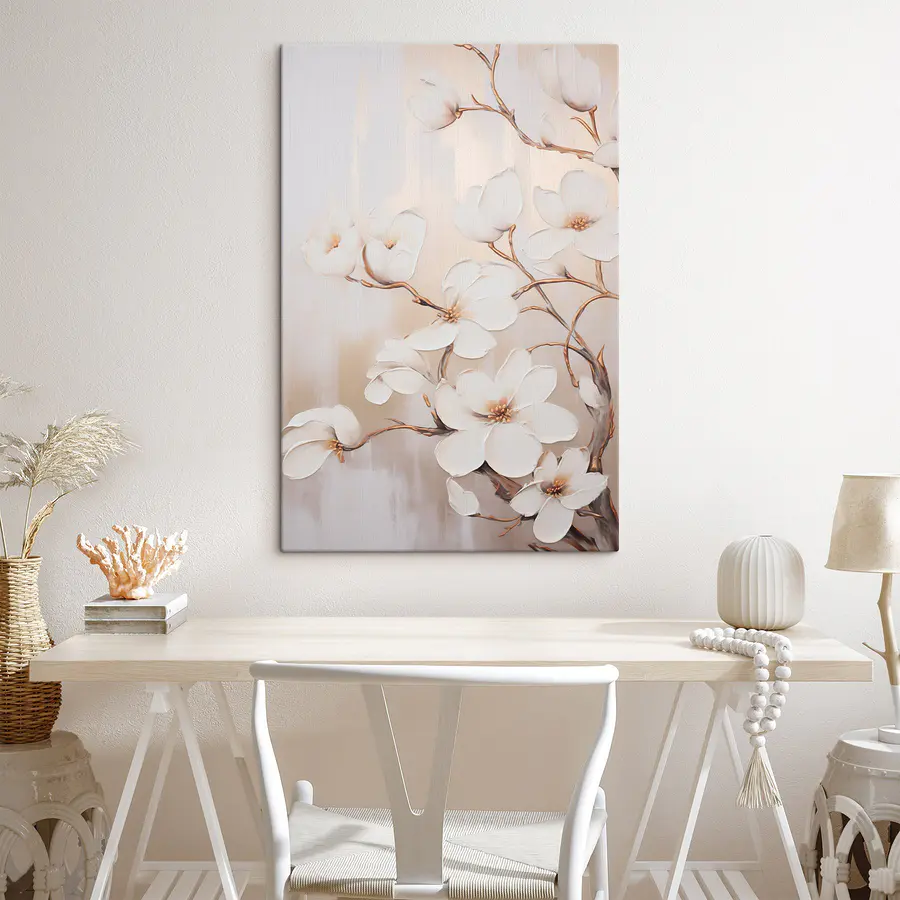 Odmienienie przestrzeni może być tak proste, jak dodanie tego obrazu na płótnie przedstawiającego białe kwiaty. To jak powiew świeżego powietrza w Twoim domu. Wyobraź sobie, że budzisz się i widzisz te kwiaty – to natychmiastowa poprawa nastroju! Delikatne płatki i subtelne kolory tworzą uspokajającą atmosferę, idealną do każdego pomieszczenia, od salonu po przytulny kącik do czytania. Niezależnie od tego, czy jest to spokojna scena dla chwil zen, czy też służy jako wesoły początek rozmowy, ten element szepcze elegancję bez zamieszania. Kto nie chciałby odrobiny piękna natury na swoich ścianach?