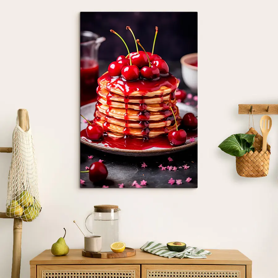 Wyobraź sobie, że budzisz się ze stosem naleśników, które aż proszą się o pożarcie. Ten wydruk na płótnie oddaje ten pyszny moment, ociekający słodkim syropem wiśniowym i zwieńczony jasnymi, soczystymi wiśniami. To jak ciepły uścisk w kuchni lub jadalni, natychmiast wywołujący radość i odrobinę głodu (zdarza się!). Idealny dla każdego, kto wierzy, że jedzenie jest sztuką – a co jest lepsze niż kulinarne arcydzieło? Ten żywy element dodaje odrobinę koloru i kaprysu, kierując rozmowy w stronę brunchu i najsłodszych chwil w życiu. Powieś go i daj się ponieść naleśnikowym wibracjom!