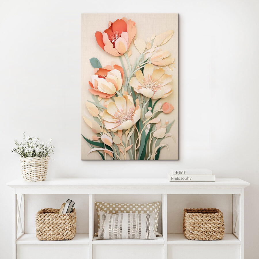 Odmień każdą przestrzeń dzięki temu czarującemu wydrukowi na płótnie, przedstawiającemu piękne kwiaty wycinane z papieru, które wprowadzają odrobinę natury do wnętrza. Wyobraź sobie, że wchodzisz do swojego pokoju i czujesz falę spokoju, gdy te żywe kwiaty tańczą na ścianie, szepcząc wiosenne wibracje przez cały rok. Idealne do ożywienia salonu lub dodania figlarnego akcentu do sypialni, to jak posiadanie osobistego ogrodu bez kłopotliwego podlewania. Znajomi będą się zastanawiać, jak można osiągnąć taki urok bez wysiłku. To nie tylko dekoracja; to zaproszenie do zatrzymania się i powąchania – lub w tym przypadku, podziwiania – kwiatów.