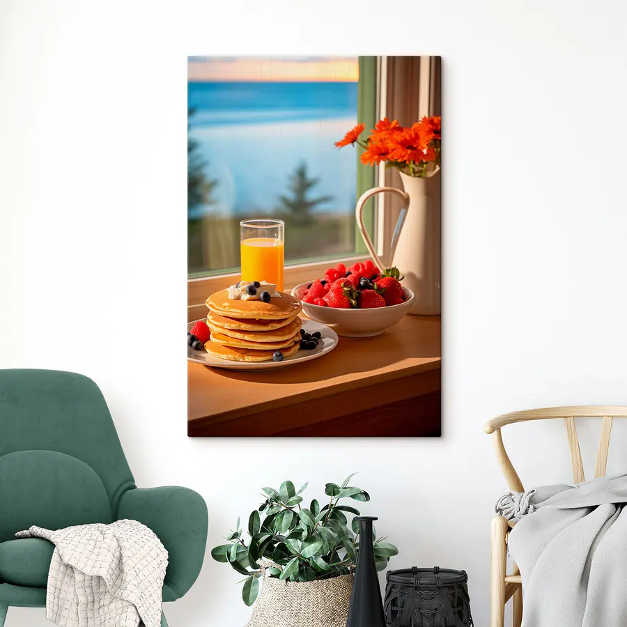 Rozpocznij dzień od odrobiny radości! Ten druk na płótnie przedstawiający zachwycający stos naleśników, zwieńczony żywymi jagodami i orzeźwiającą szklanką soku, to uczta dla oczu. Wyobraź sobie tę ciepłą scenę wiszącą w kuchni lub jadalni – to tak, jakby każdego ranka mieć przy sobie śniadaniowych przyjaciół! Zachęcające kolory przywołują na myśl leniwe niedzielne poranki lub wesołe brunche z przyjaciółmi. Wyobraź sobie uśmiechy i dobre wibracje, które przynosi, sprawiając, że każdy posiłek wydaje się nieco bardziej wyjątkowy. Idealny dla miłośników jedzenia, ten przedmiot doda smacznego akcentu do każdej przestrzeni!