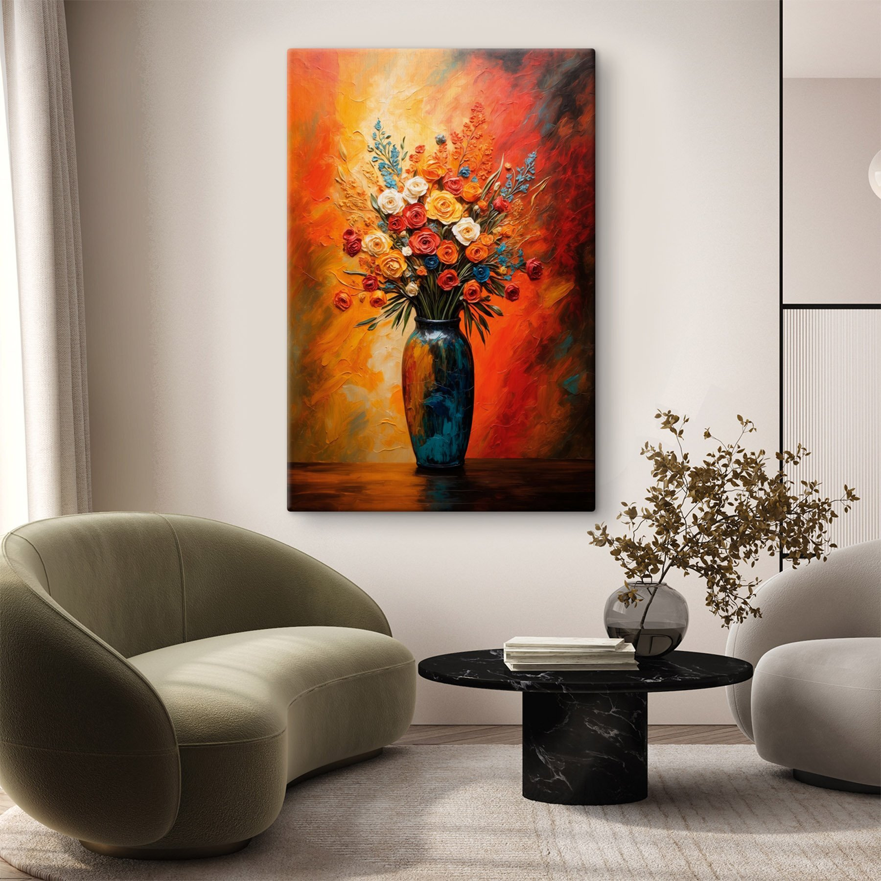 Odmień każde pomieszczenie dzięki temu żywemu drukowi na płótnie przedstawiającemu oszałamiający bukiet kwiatów w pięknie zaprojektowanym wazonie. Bogate kolory – jasne czerwienie, słoneczne żółcie i chłodne zielenie – wprowadzą radosną eksplozję natury prosto do Twojego domu. Wyobraź sobie, że po przebudzeniu witają Cię radosne kolory, które natychmiast poprawiają nastrój. To jak posiadanie małego ogrodu, który nigdy nie więdnie, idealnego na te szare dni, kiedy potrzebny jest przypływ słońca. Śmiało, pozwól kwiatom mówić, dodając jednocześnie odrobinę ciepła do swojej przestrzeni. To z pewnością będzie początek rozmowy!