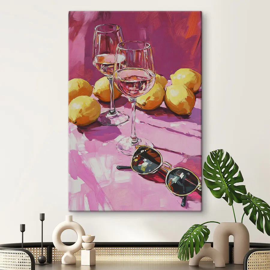 Ten żywy wydruk na płótnie przedstawiający kieliszki do wina i jasne cytryny jest jak słoneczny dzień uchwycony na ścianie. Wyobraź sobie, że rozjaśnia przytulną kuchnię lub tętniącą życiem jadalnię, wprowadzając odrobinę koloru i radości. Zabawny kontrast różu i żółci daje radosny nastrój, który zachęca do śmiechu i dobrej zabawy. Wyobraź sobie, że organizujesz kolację, a przyjaciele podziwiają dzieła sztuki i czują tę lekką energię. To nie tylko dekoracja; to początek rozmowy, kawałek szczęścia wiszący tuż przed tobą. Idealny dla tych, którzy cenią sobie odrobinę zabawy w swojej przestrzeni!