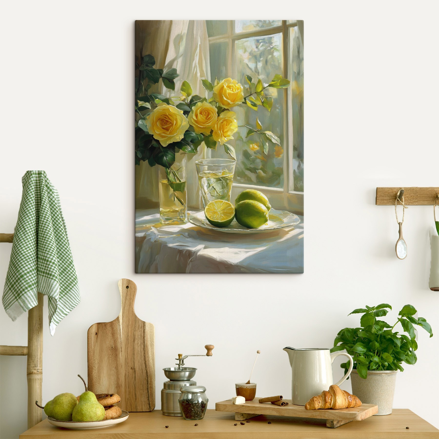 Rozjaśnij każdą przestrzeń dzięki temu zachwycającemu płótnu przedstawiającemu żółte róże i soczyste cytryny wylegujące się na talerzu. To jak wypełnione słońcem popołudnie uwięzione na ścianie! Wyobraź sobie, że przechodzisz obok i dostrzegasz te radosne kwiaty – ich delikatny zapach niemal unosi się w powietrzu, sprawiając, że czujesz się nieco lżej. Żywe żółcie i świeże zielenie mogą wnieść odrobinę koloru do każdego pomieszczenia. Idealny do kuchni lub jadalni, przypomina o prostszych radościach – świeżych kwiatach, orzeźwiających napojach i tych małych chwilach, które sprawiają, że życie jest słodkie. Kto nie chciałby trochę więcej słońca w swoim dniu?