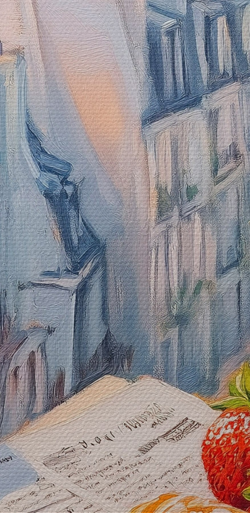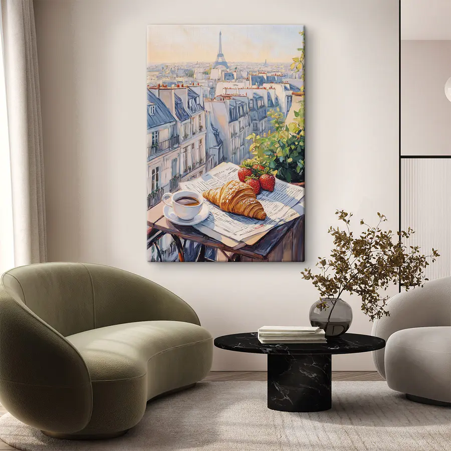 Wyobraź sobie rozpoczęcie dnia z widokiem, który zapiera dech w piersiach. Ten wydruk na płótnie przedstawia przytulną scenę śniadaniową, w której parująca filiżanka kawy siedzi obok kruchego rogalika i soczystych truskawek, a wszystko to otoczone uroczymi paryskimi dachami. To jak przeniesienie się na skąpany w słońcu balkon, gdzie znika zgiełk miasta. Delikatne kolory i zachęcająca atmosfera zachęcają do marzeń na jawie – kto nie chciałby popijać kawy, zanurzając się w tej spokojnej atmosferze? Idealny do kuchni lub jadalni, ten element doda ciepła i odrobiny wędrówki do każdej przestrzeni. Chwyć kawałek tej magii i pozwól swoim ścianom opowiedzieć historię!