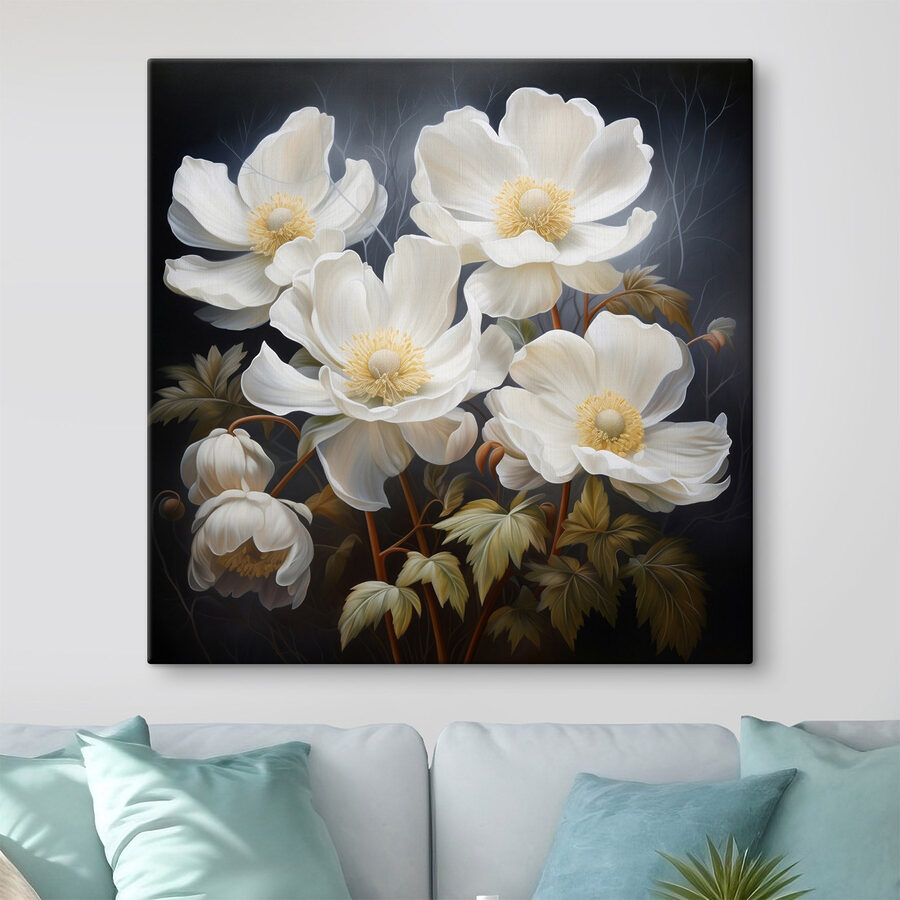 Odetchnij świeżym powietrzem dzięki temu wspaniałemu obrazowi na płótnie z pięknymi białymi kwiatami. Każdy kwiat wydaje się tańczyć na płótnie, zapraszając poczucie spokoju i pogody ducha do każdej przestrzeni. Wyobraź sobie, że przechodzisz obok niego i czujesz się, jakbyś właśnie wszedł do sennego ogrodu, bez konieczności posiadania zielonego kciuka. Niezależnie od tego, czy jest to przytulny kącik do czytania, czy rozjaśnienie salonu, ten element bez wysiłku dodaje uroku i charakteru. To jak posiadanie małego kawałka natury w domu – idealne na te dni, kiedy wolisz cieszyć się kwiatami, niż się nimi zajmować. Ta grafika z pewnością pobudzi do rozmów i stworzy zachęcającą atmosferę dla przyjaciół i rodziny.