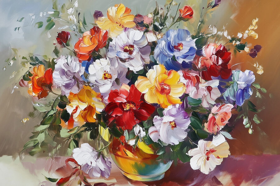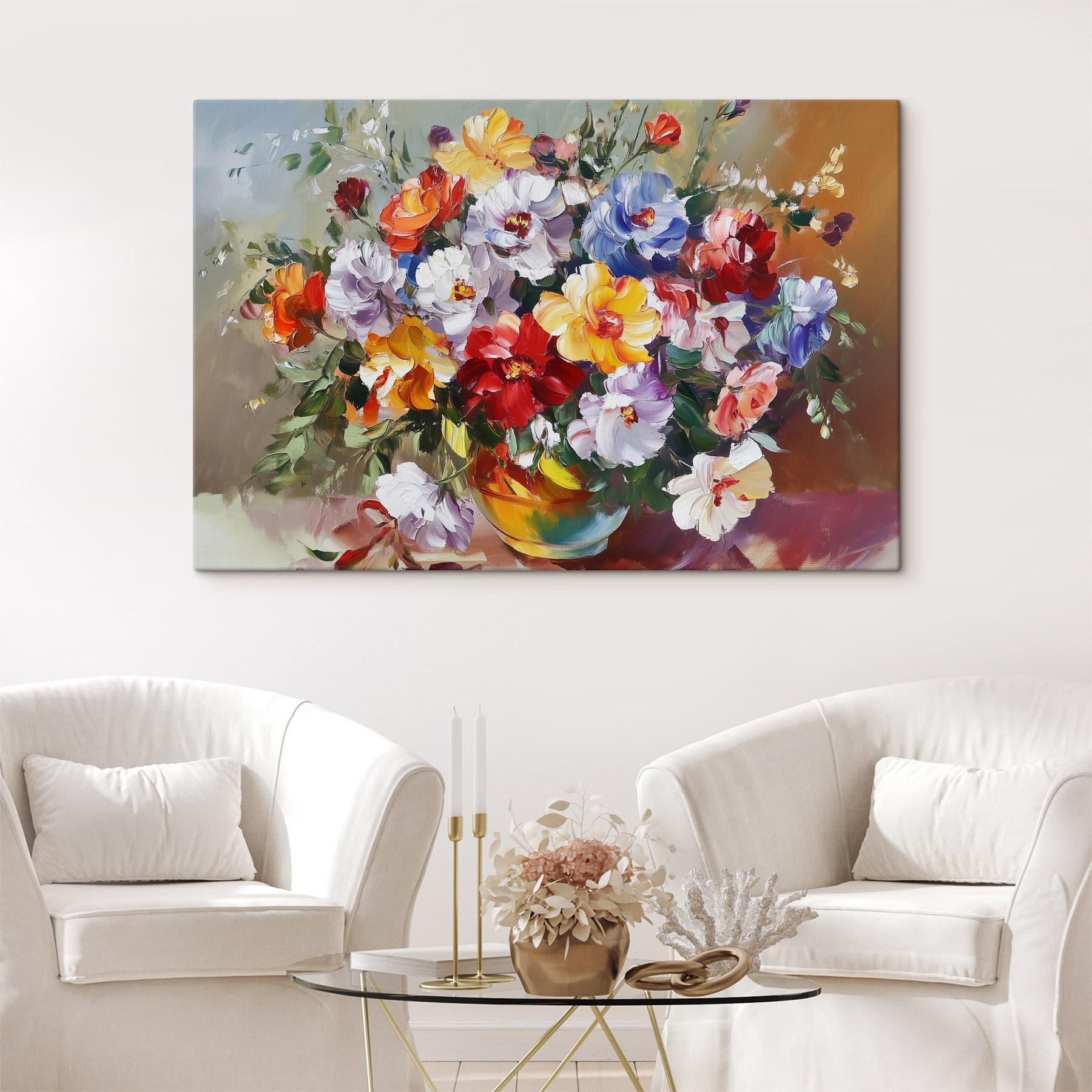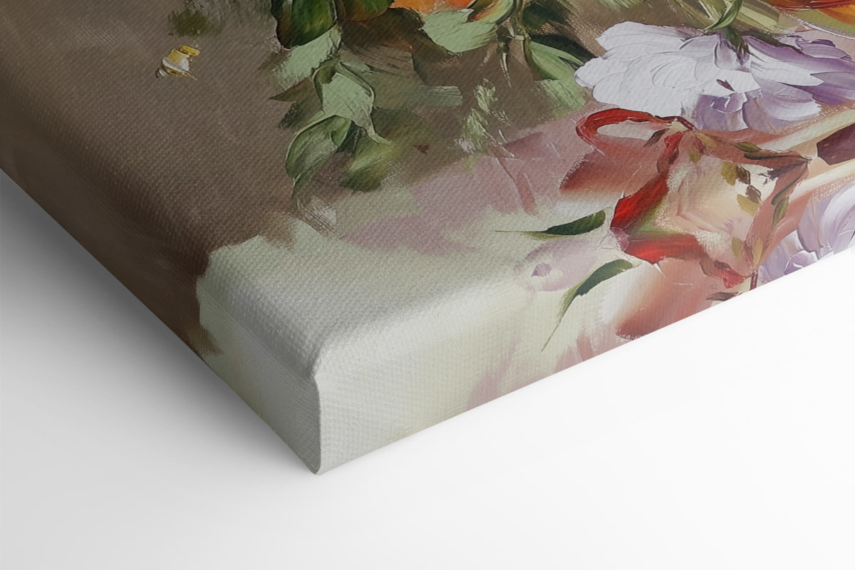 Rozjaśnij każde pomieszczenie tym zachwycającym wydrukiem na płótnie przedstawiającym żywy bukiet kwiatów w wazonie – idealny dla tych, którzy nie mogą utrzymać prawdziwych kwiatów przy życiu! Wyobraź sobie, że wchodzisz do swojego pokoju i wita Cię feeria barw i radości. Zabawna mieszanka kwiatów wnosi odrobinę natury do wnętrza, dzięki czemu jest świetnym początkiem rozmowy. To tak, jakby ogród postanowił uwolnić się i zatańczyć na ścianie. Niezależnie od tego, czy jest to salon, czy przytulny kącik, w którym popijasz kawę, ten nadruk tworzy zachęcającą atmosferę, która po prostu dobrze się czuje. Kto nie potrzebuje od czasu do czasu odrobiny kwiatowej magii?