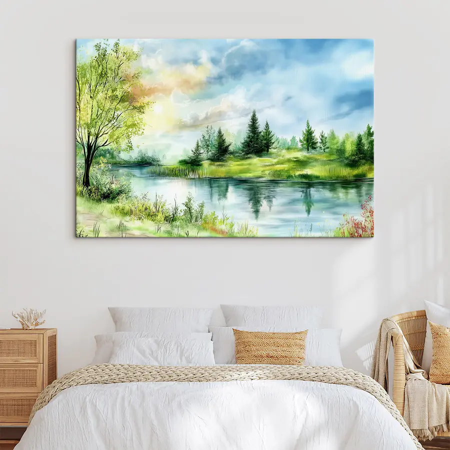 Przekształć dowolny pokój w spokojną ucieczkę dzięki tej uroczej akwareli. Wyobraź sobie spokojne jezioro, delikatnie otoczone kołyszącymi się drzewami i bujnymi trawami, skąpane w miękkim, sennym świetle. To jak mini wakacje dla twoich ścian, zapraszające do tych przytulnych chwil refleksji. Niezależnie od tego, czy wisi nad wygodną kanapą, czy w kąciku do czytania, pobudza marzenia o leniwych popołudniach spędzonych nad wodą. Żywe kolory mogą podnieść na duchu i tchnąć życie w nudną przestrzeń. Któż nie chciałby wrócić do domu, by podziwiać ten promienny kawałek natury? Dodaj trochę radości, ciepła, a może nawet odrobinę przygody do swojego wystroju.