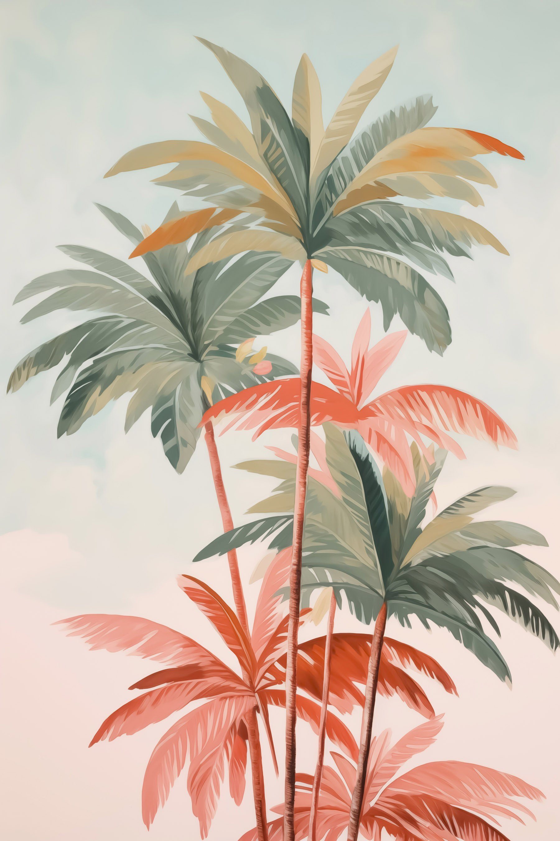 Odmień swoją przestrzeń dzięki temu żywemu obrazowi na płótnie przedstawiającemu grupę palm. Wyobraź sobie wylegiwanie się w salonie lub domowym biurze, w otoczeniu tych figlarnych zieleni i delikatnych różów, przywołujących na myśl łagodną tropikalną bryzę. To jak mini-wakacje bezpośrednio na ścianie! Spokojna atmosfera tych palm zachęca do ciepła i relaksu, sprawiając, że każdy dzień staje się nieco bardziej wyjątkowy. Idealna dla tych, którzy chcą mieć kawałek natury we wnętrzu, ta grafika wywołuje radość i zachęca do marzeń o słonecznych wybrzeżach i leniwych popołudniach. Piękny dodatek do każdego stylu wystroju!
