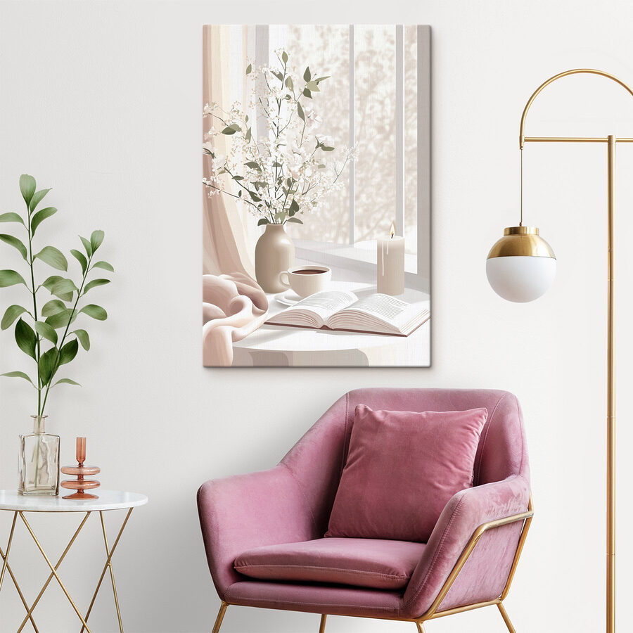 Odmień dowolny zakątek swojego domu dzięki temu uroczemu drukowi na płótnie przedstawiającemu przytulną filiżankę kawy i delikatny wazon z kwiatami na słonecznym parapecie. Ta grafika ma spokojną atmosferę, idealną do stworzenia spokojnego odosobnienia. Wyobraź sobie, jak zwijasz się w kłębek z dobrą książką, popijając ulubiony napar, a słońce przenika przez delikatne zasłony. Minimalistyczny design wnosi odrobinę natury, dzięki czemu można poczuć się jak w sennej kawiarni lub spokojnym zakątku ogrodu. Idealny do relaksu lub wywoływania radości, ten element jest jak ciepły uścisk dla ścian.